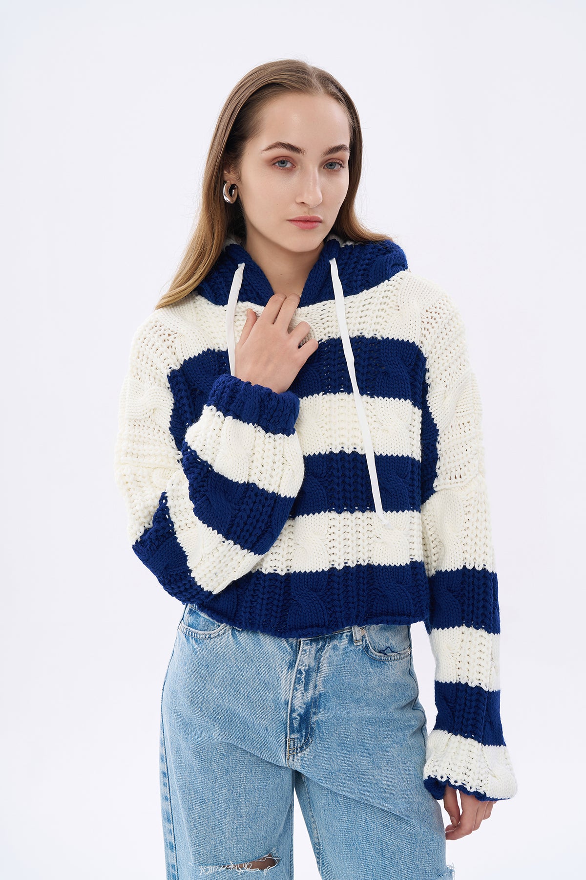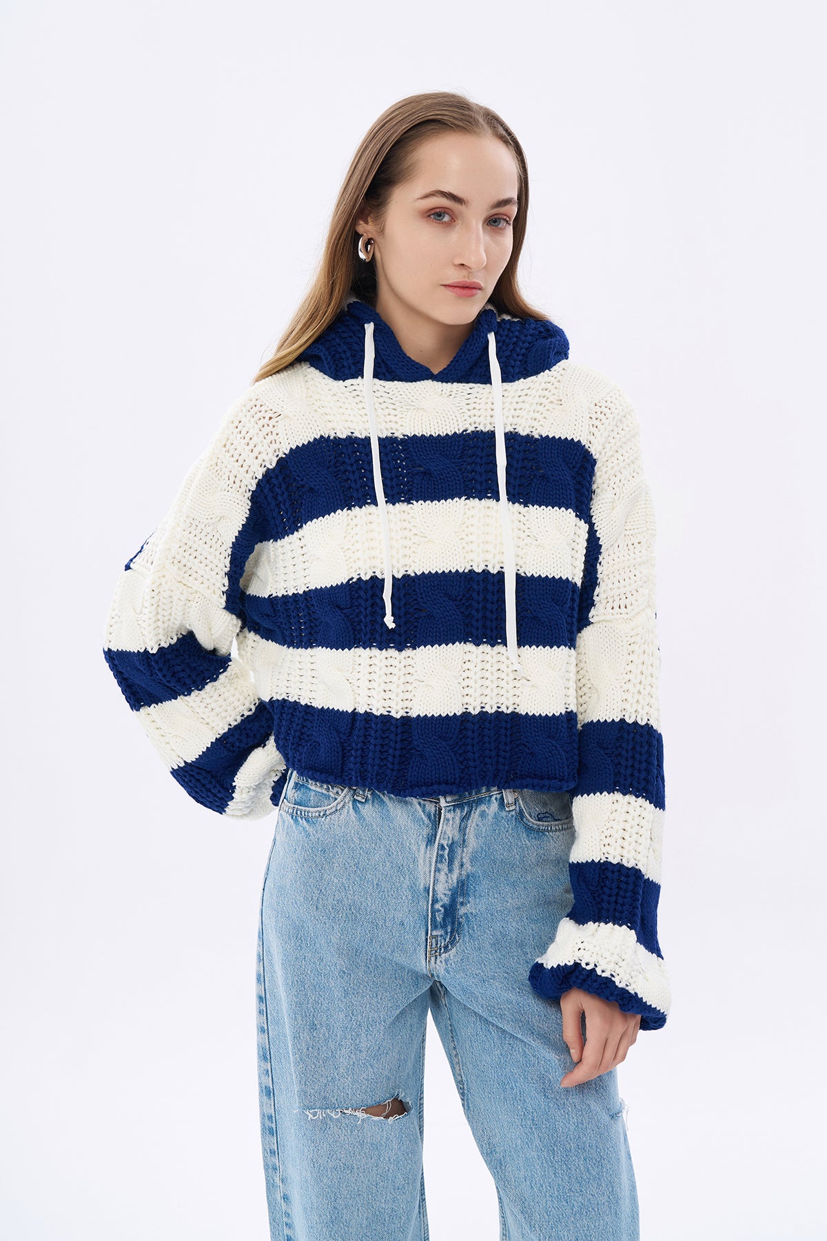 Kapüşonlu İp detaylı, genİş çİzgİlİ, uzun kollu, örgü crop kazak.