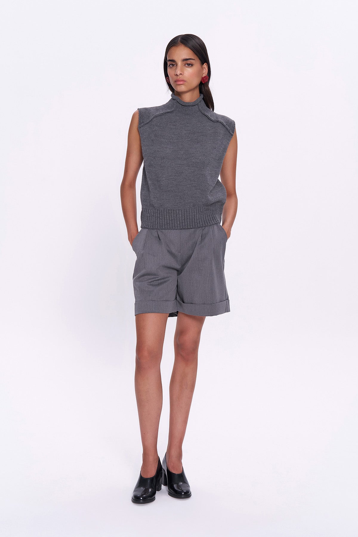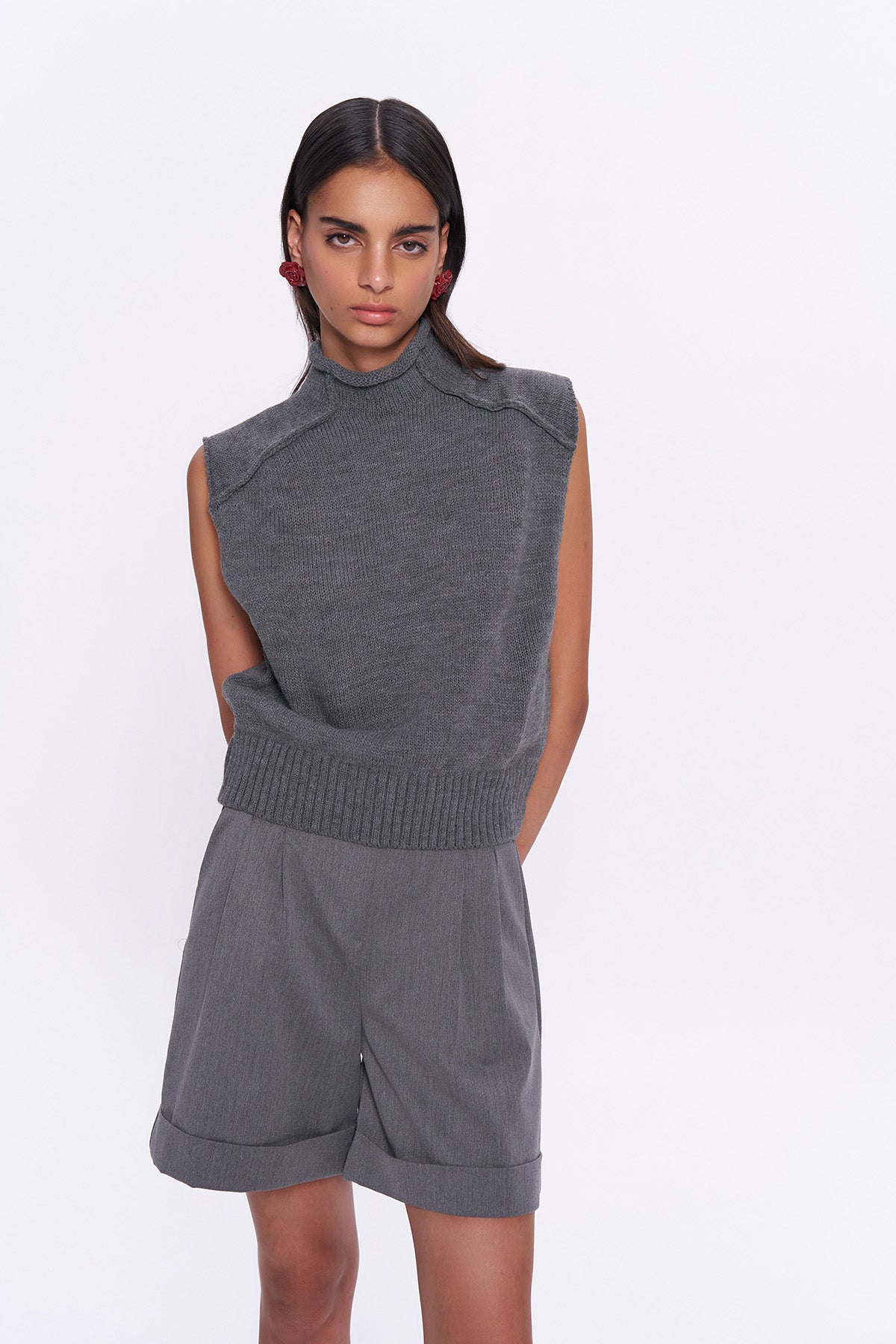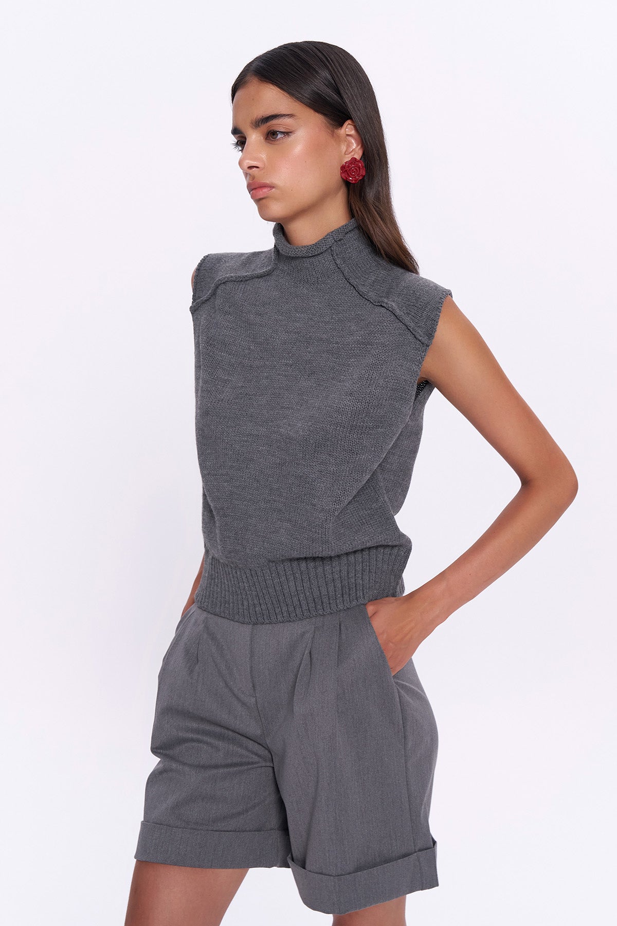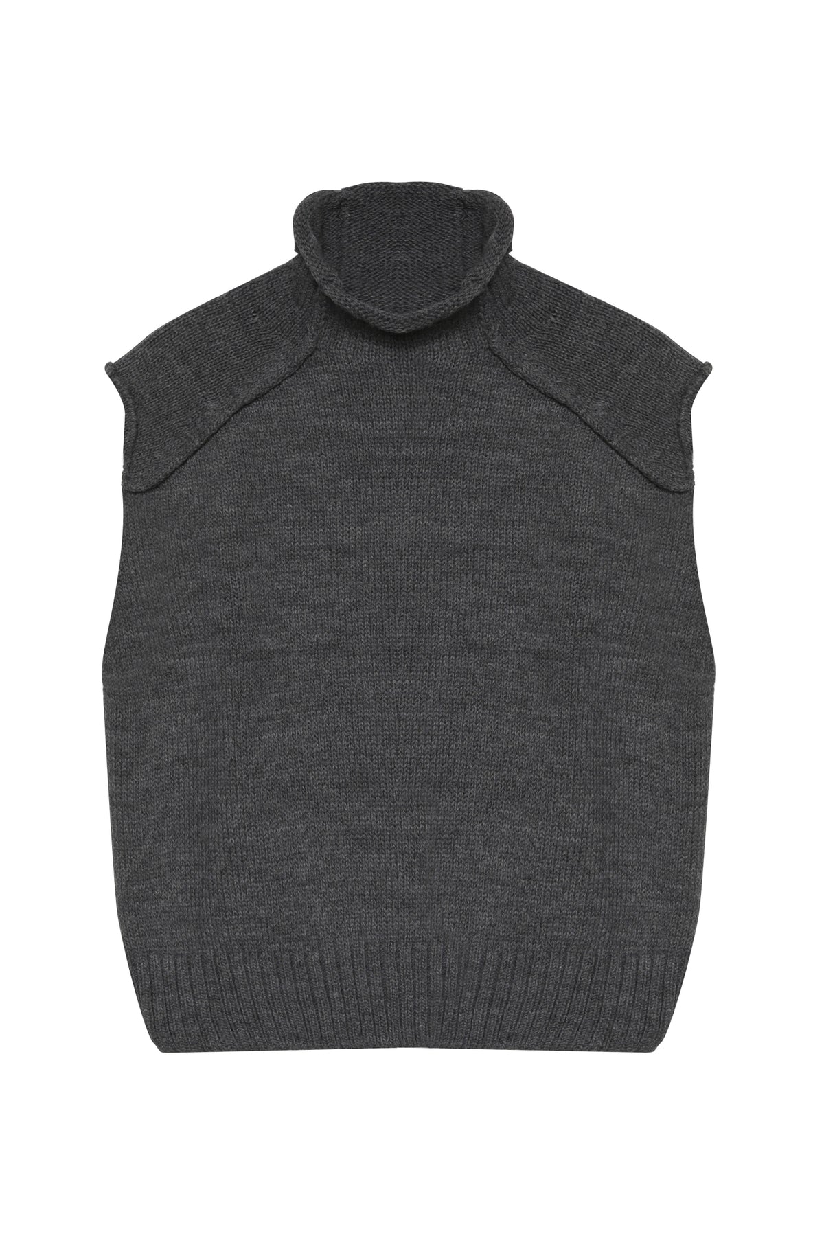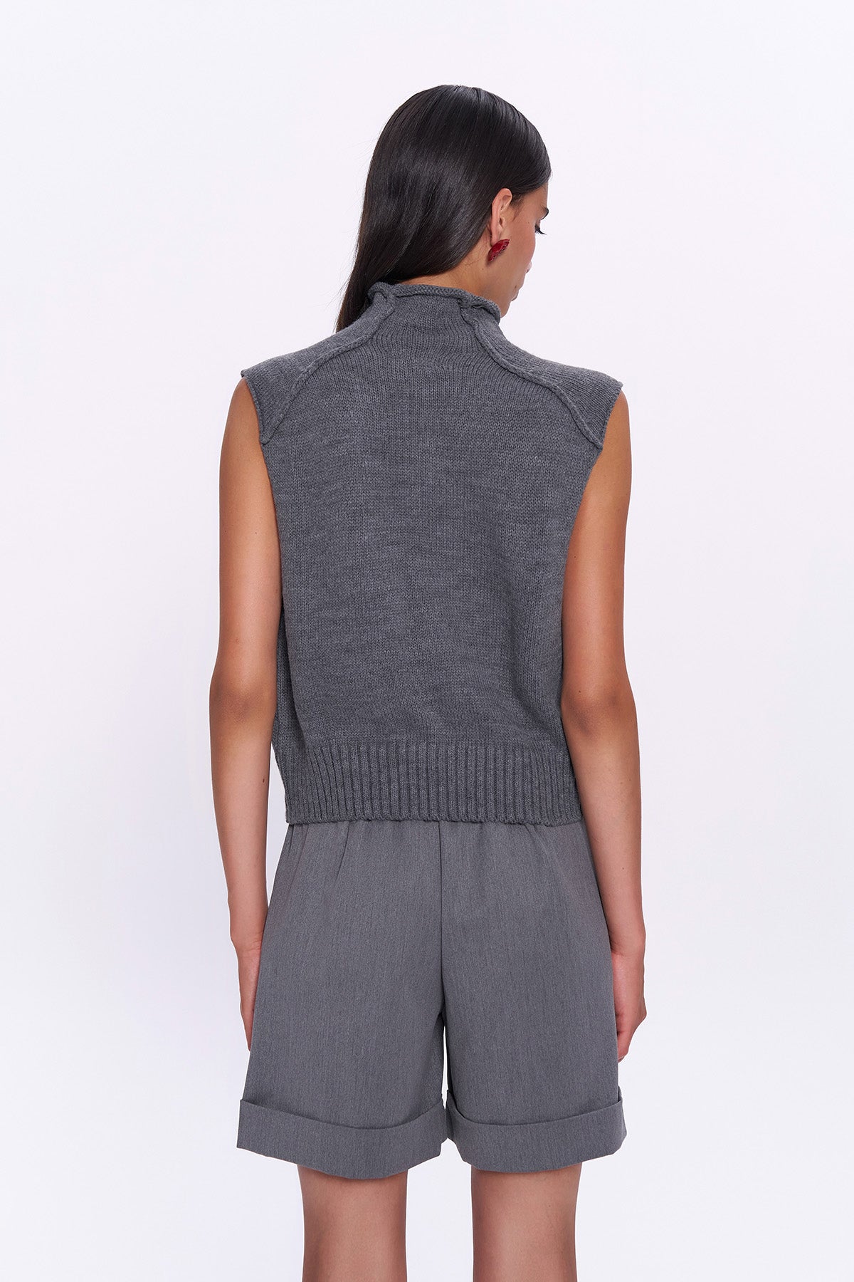 Balıkçı yaka, kolsuz, ters dİkİm detaylara sahİp süveter trİko.