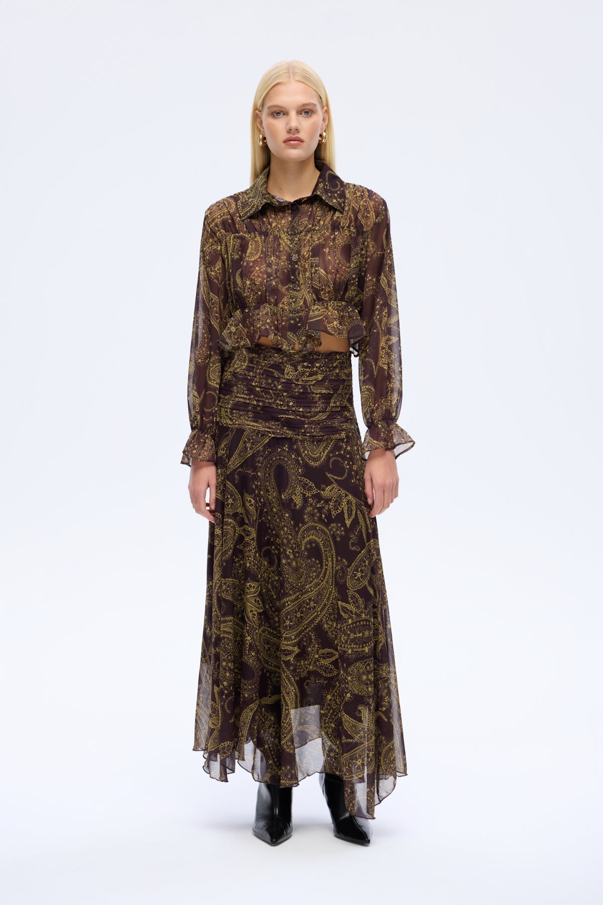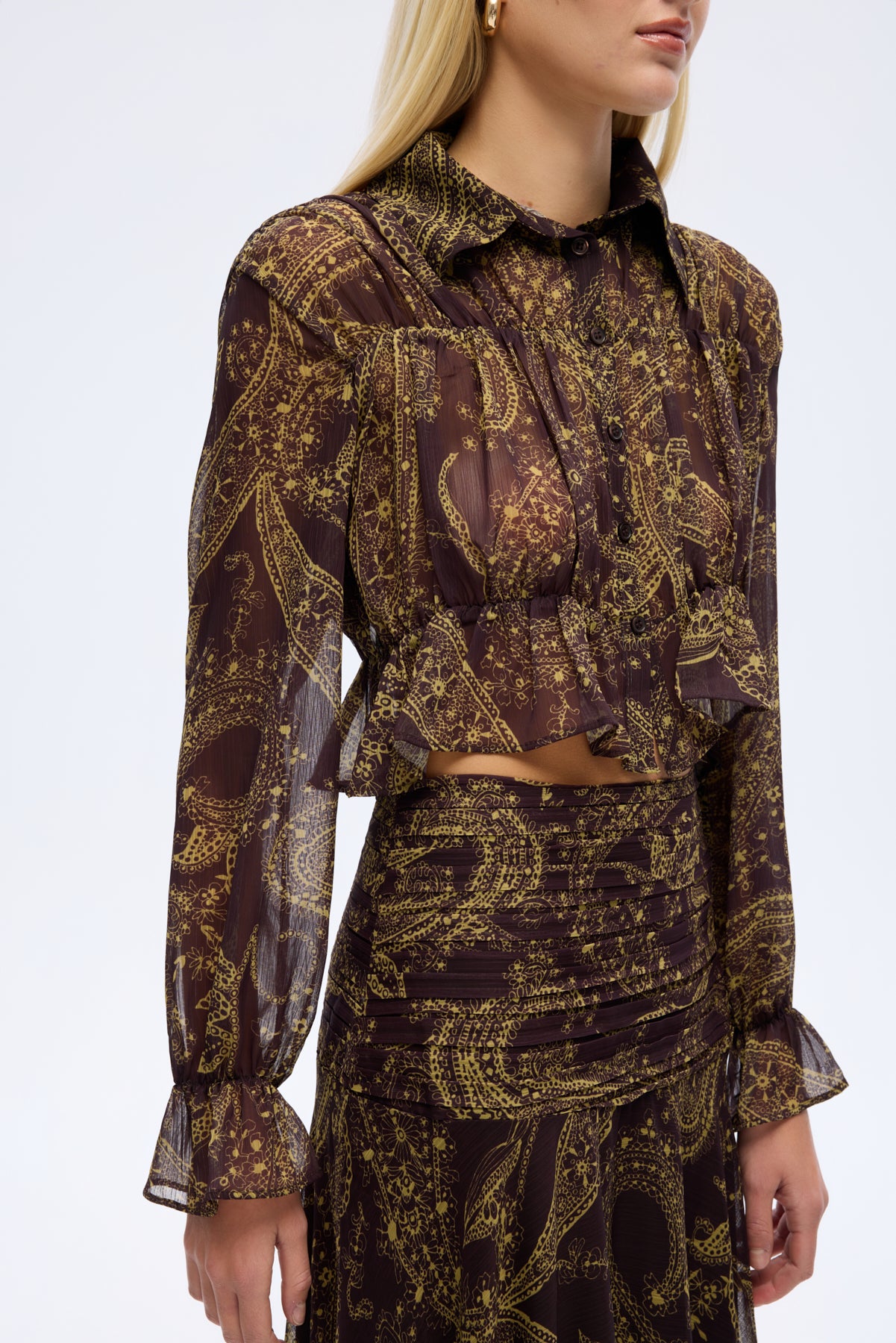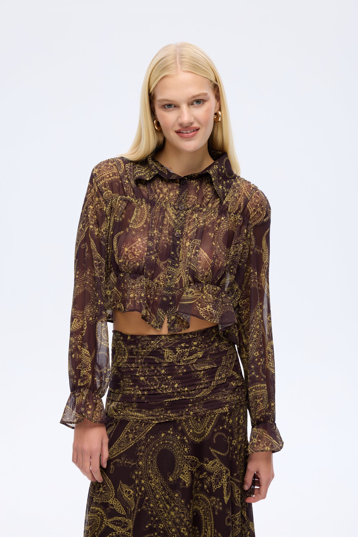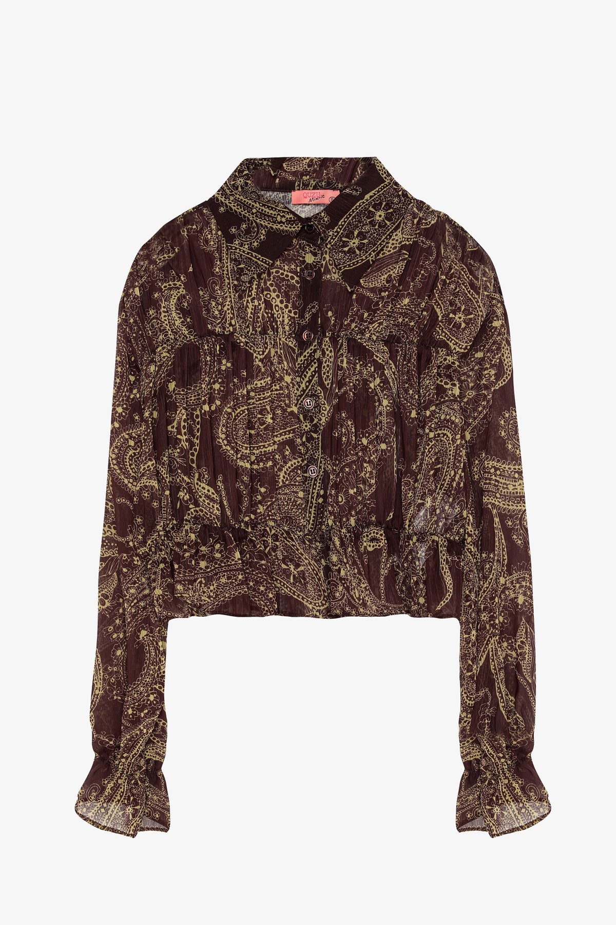 Desenli şifon kumaştan, lastik detaylı, uzun kollu, düğme kapamalı, ince kumaştan, crop boy gömlek yaka bluz.