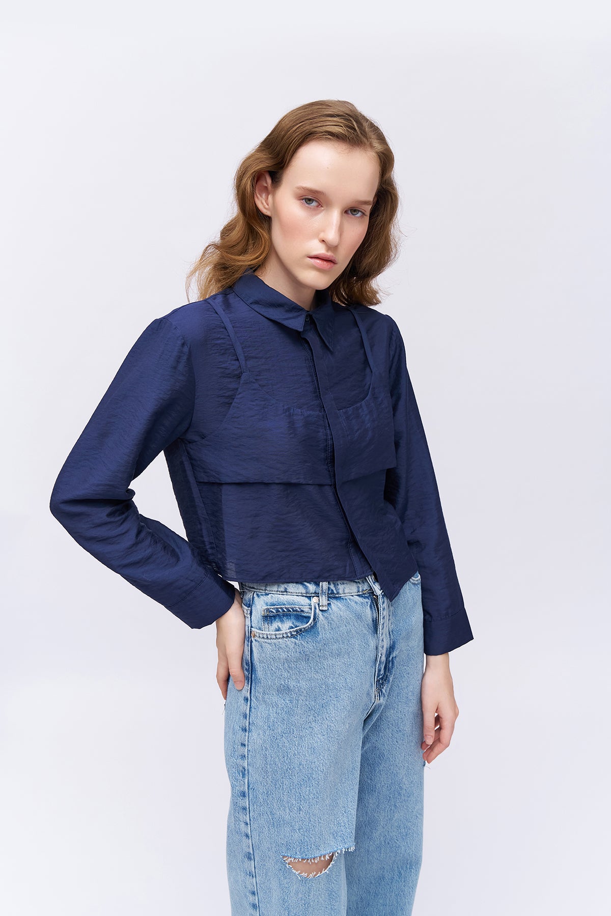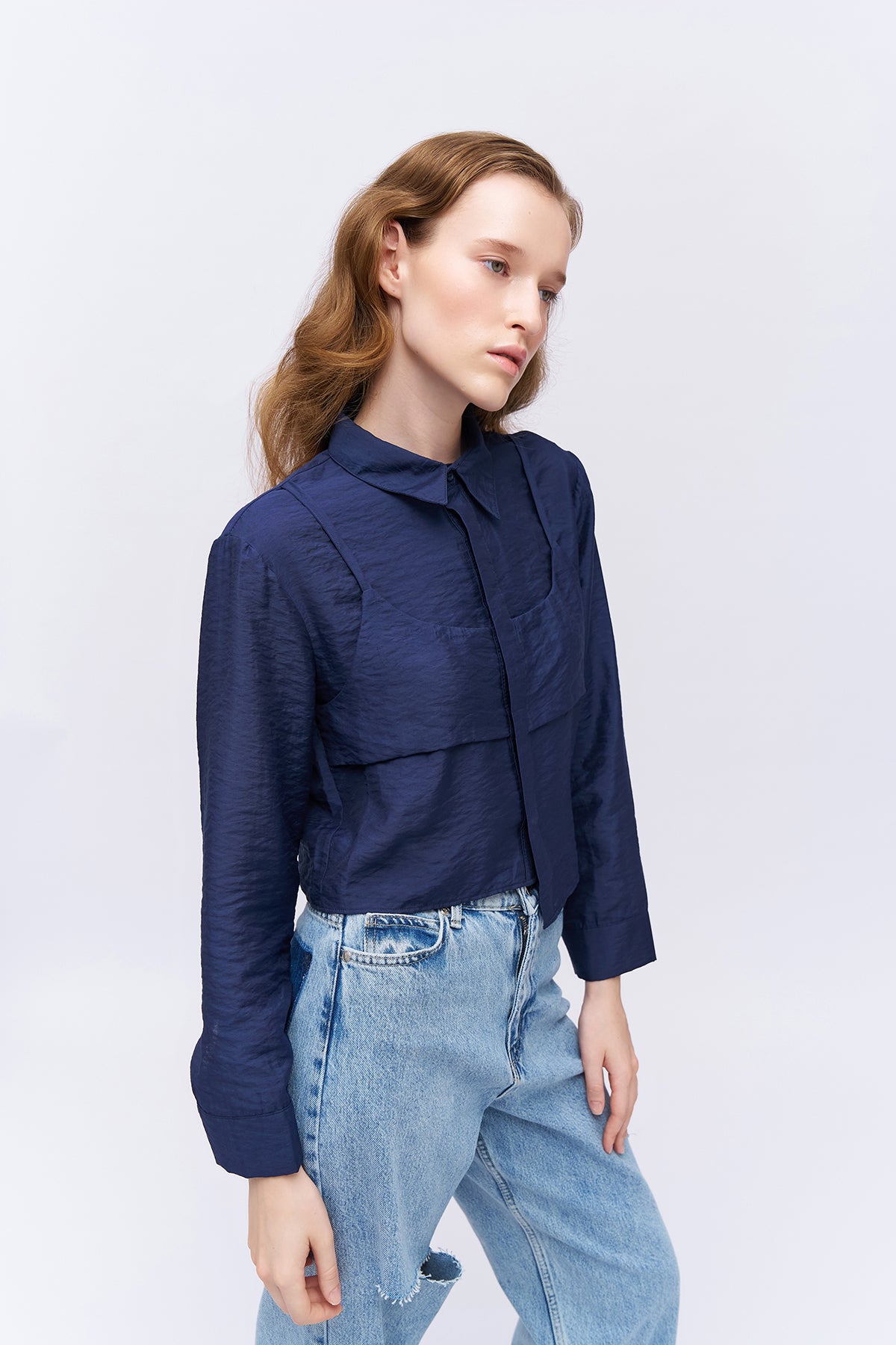 Asİmetrİk detaylı, uzun kol, saten gömlek.