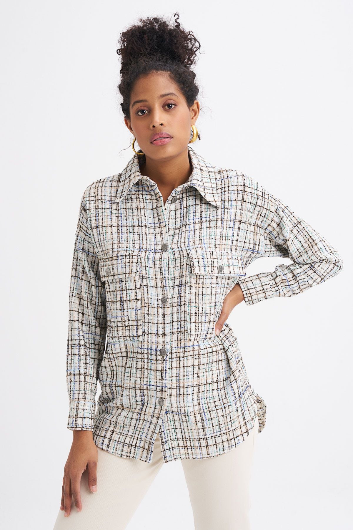 Tweed Pocketed Plaid Shirt Blue
