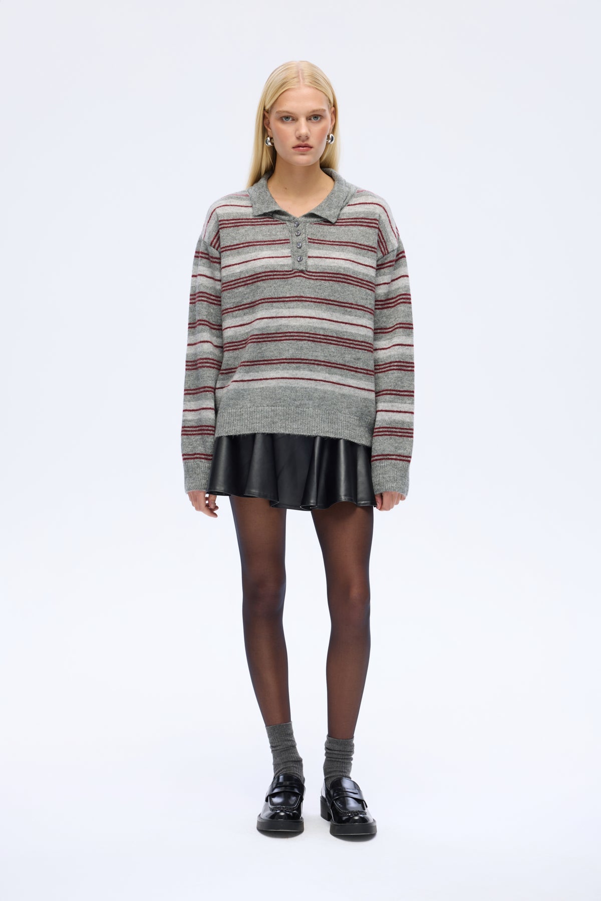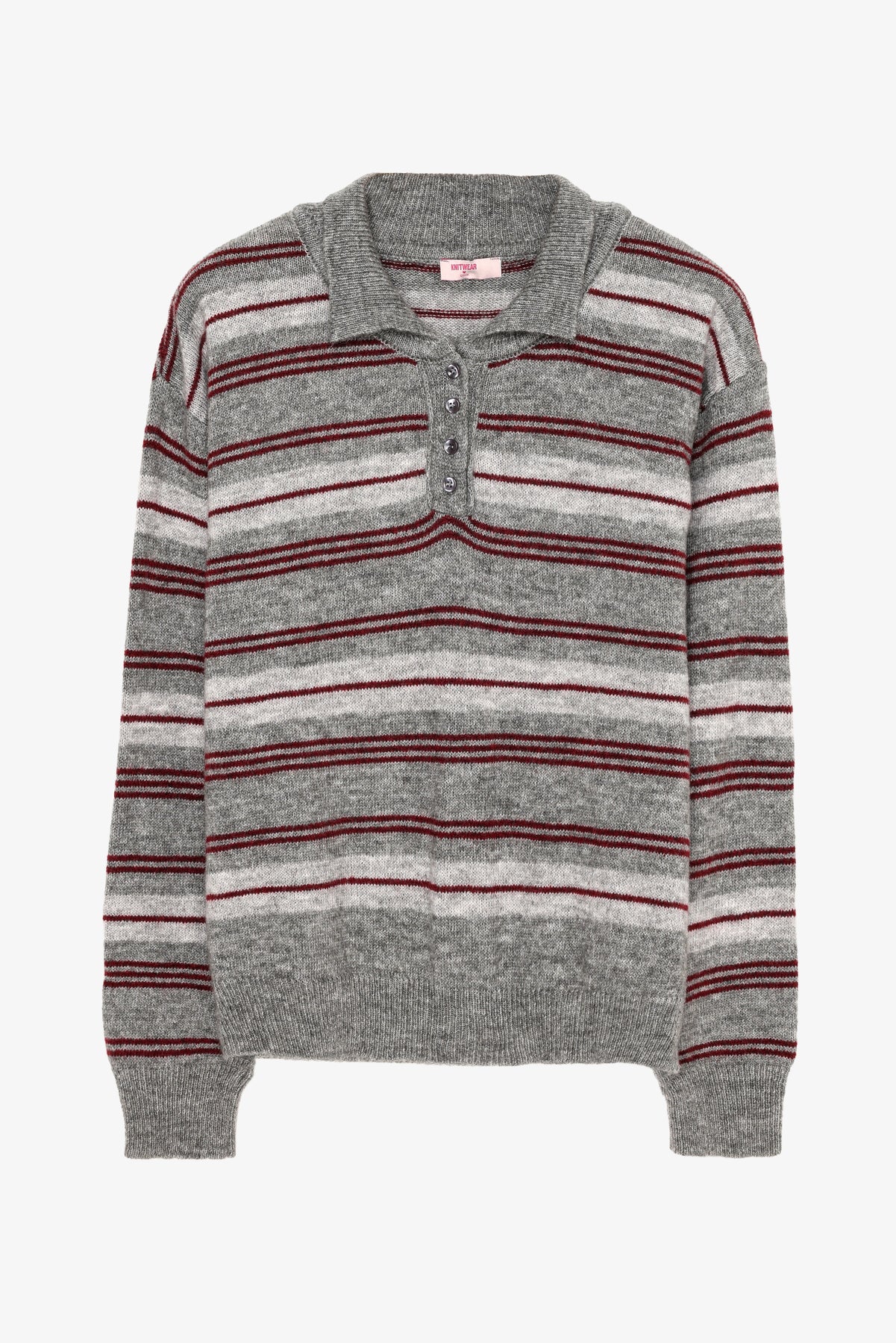 Polo yaka, yaka kısmı düğme detaylı, yatay çizgili desenli, uzun kollu, yumuşak dokulu, rahat kalıp triko kazak.