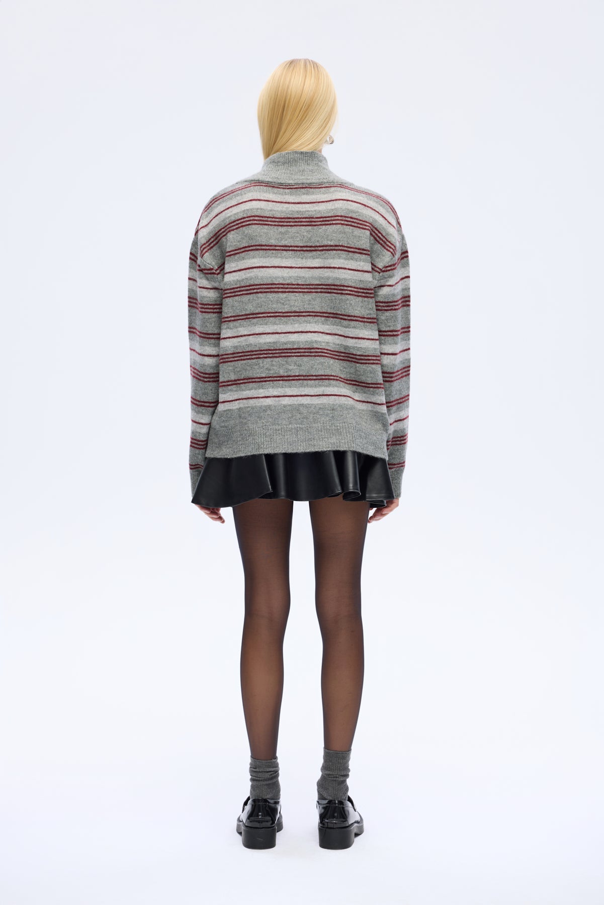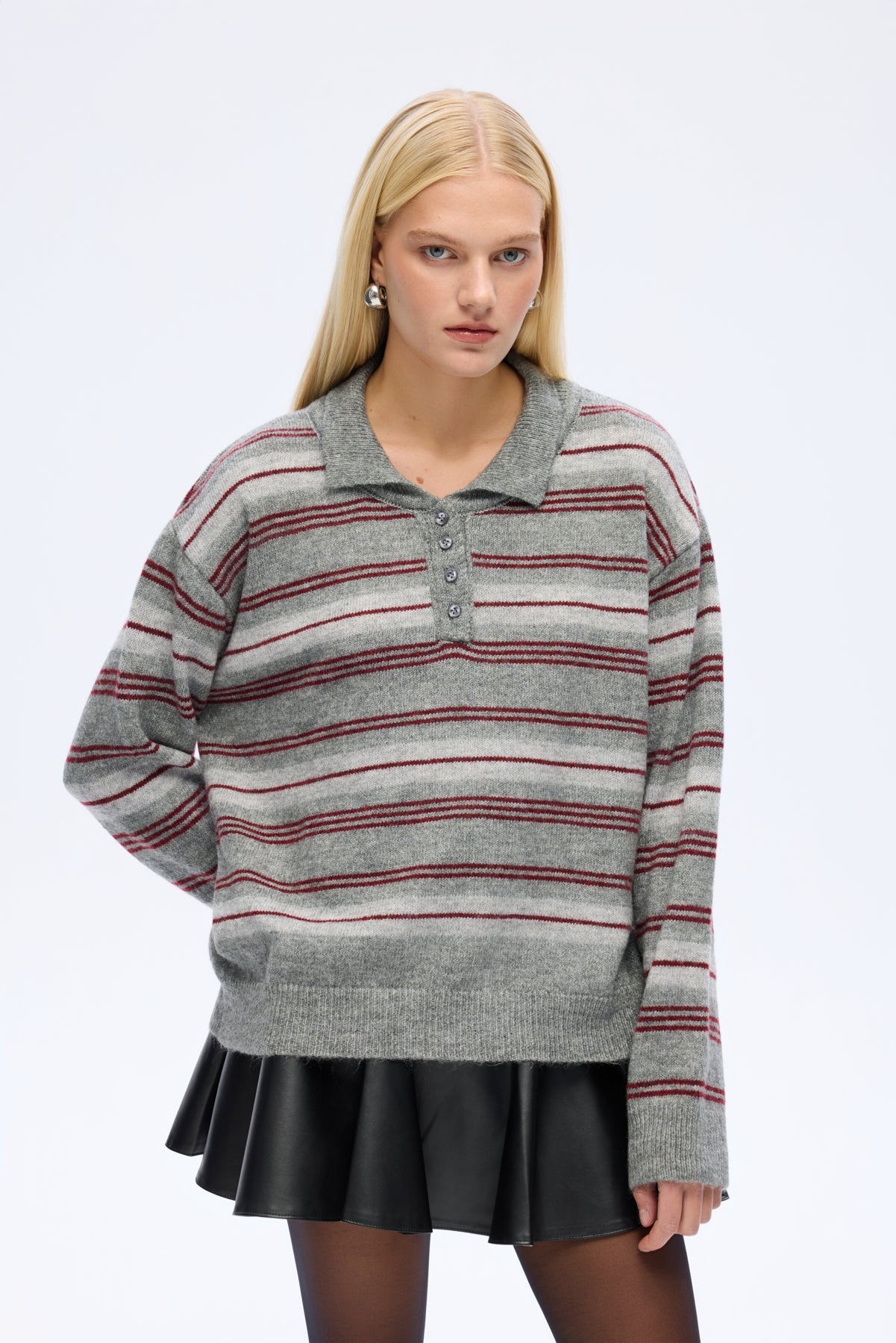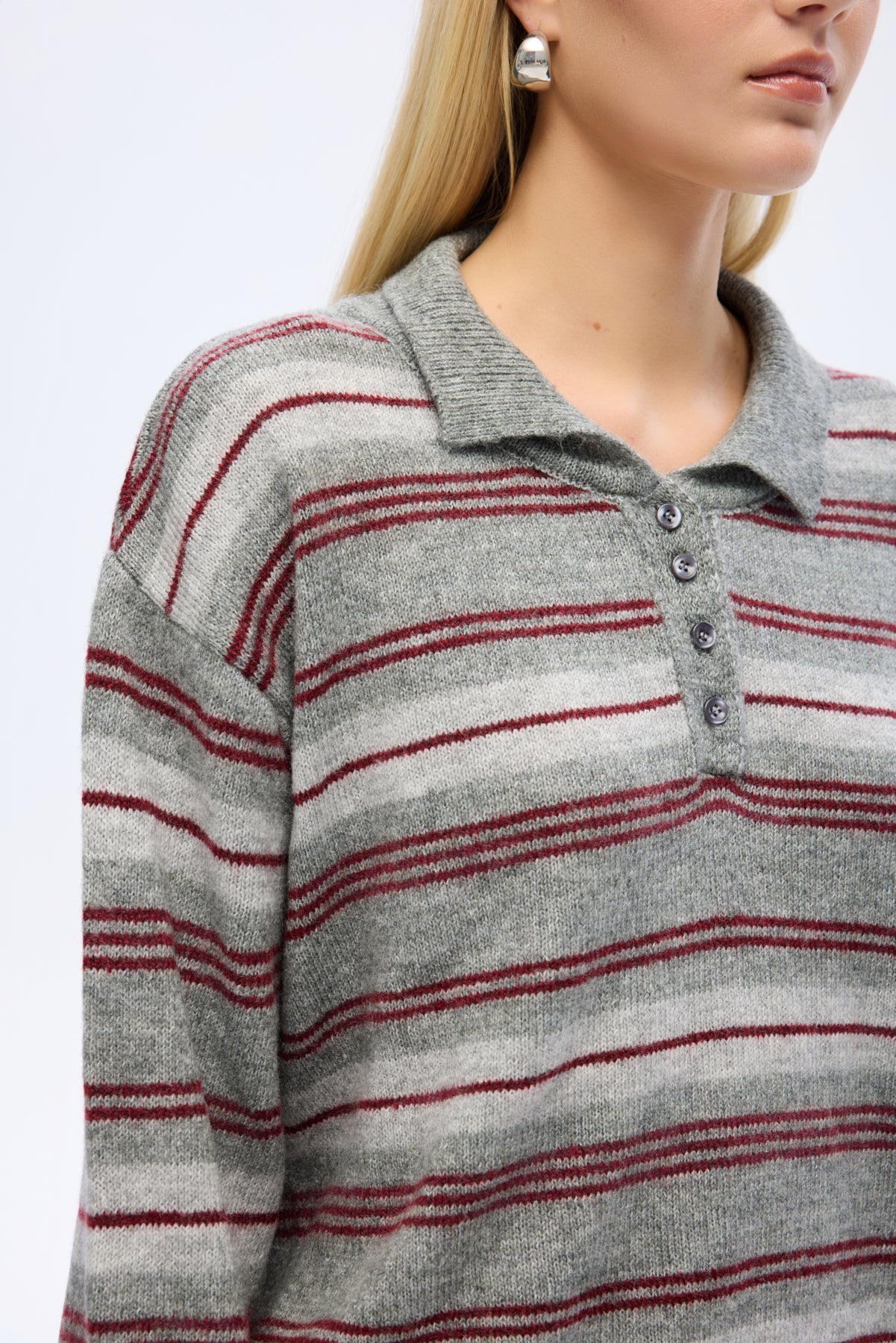 Ribanalı Polo Yaka Çizgili Triko Kazak Gri