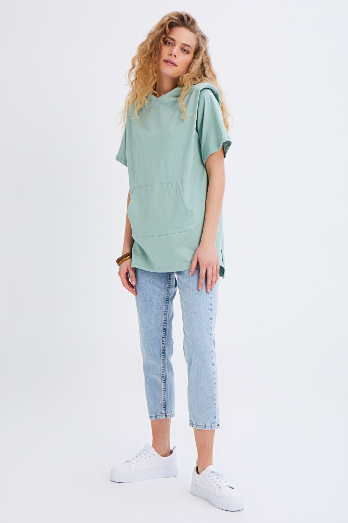 Hooded Kangaroo Pocket Long Sweatshirt Mint