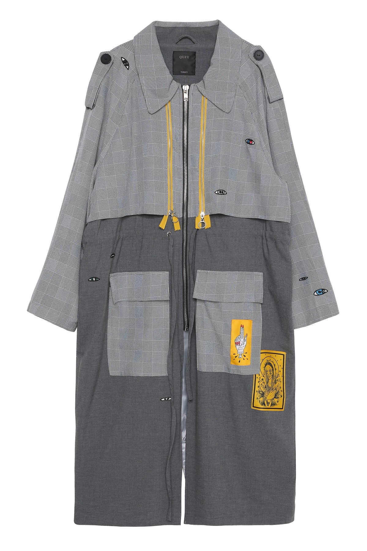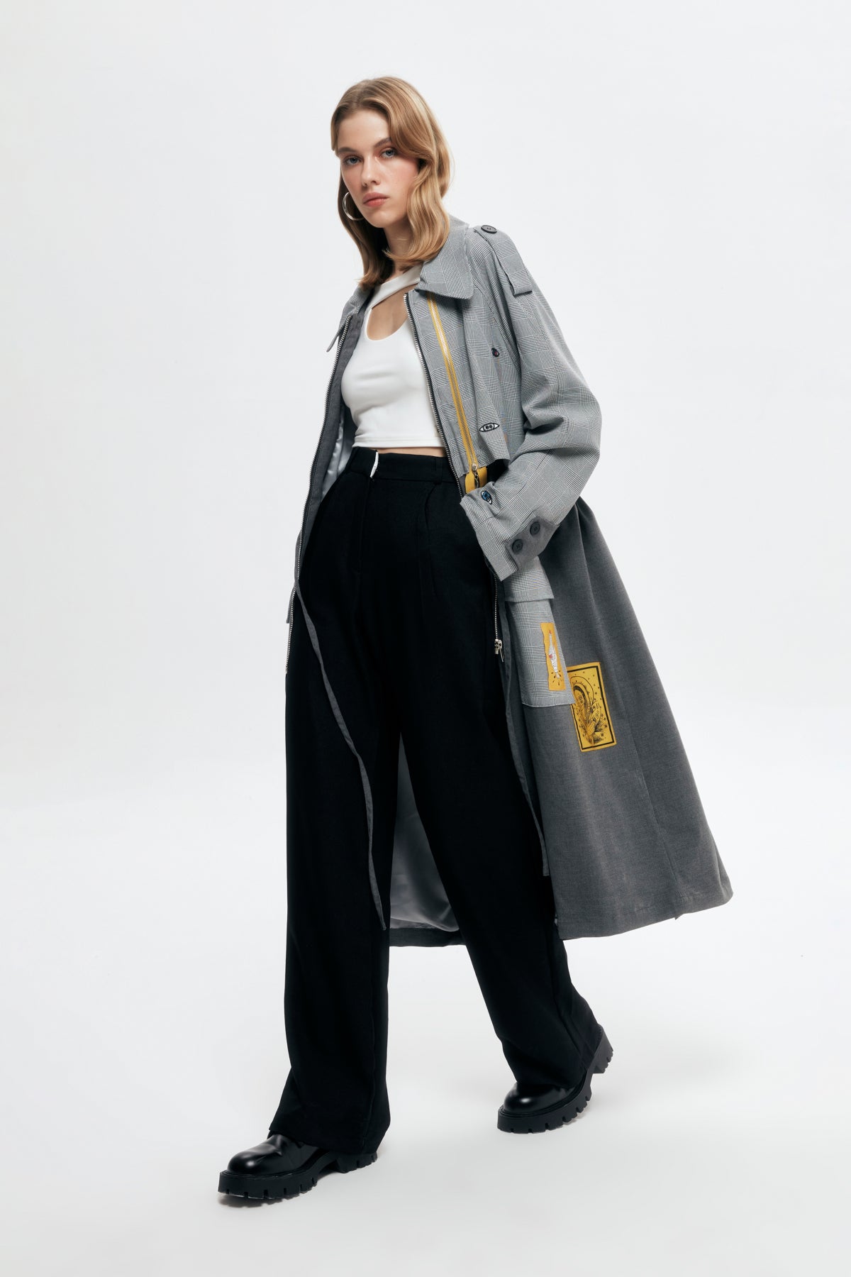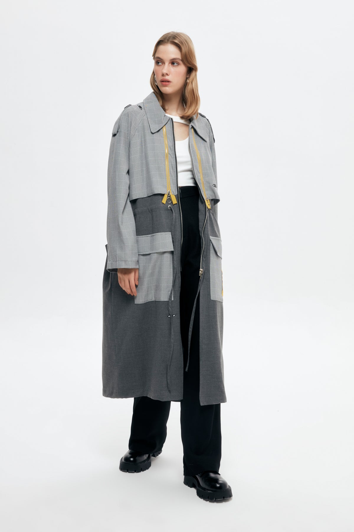 Zipper Detailed Colorful Patterned Trench Coat Gray