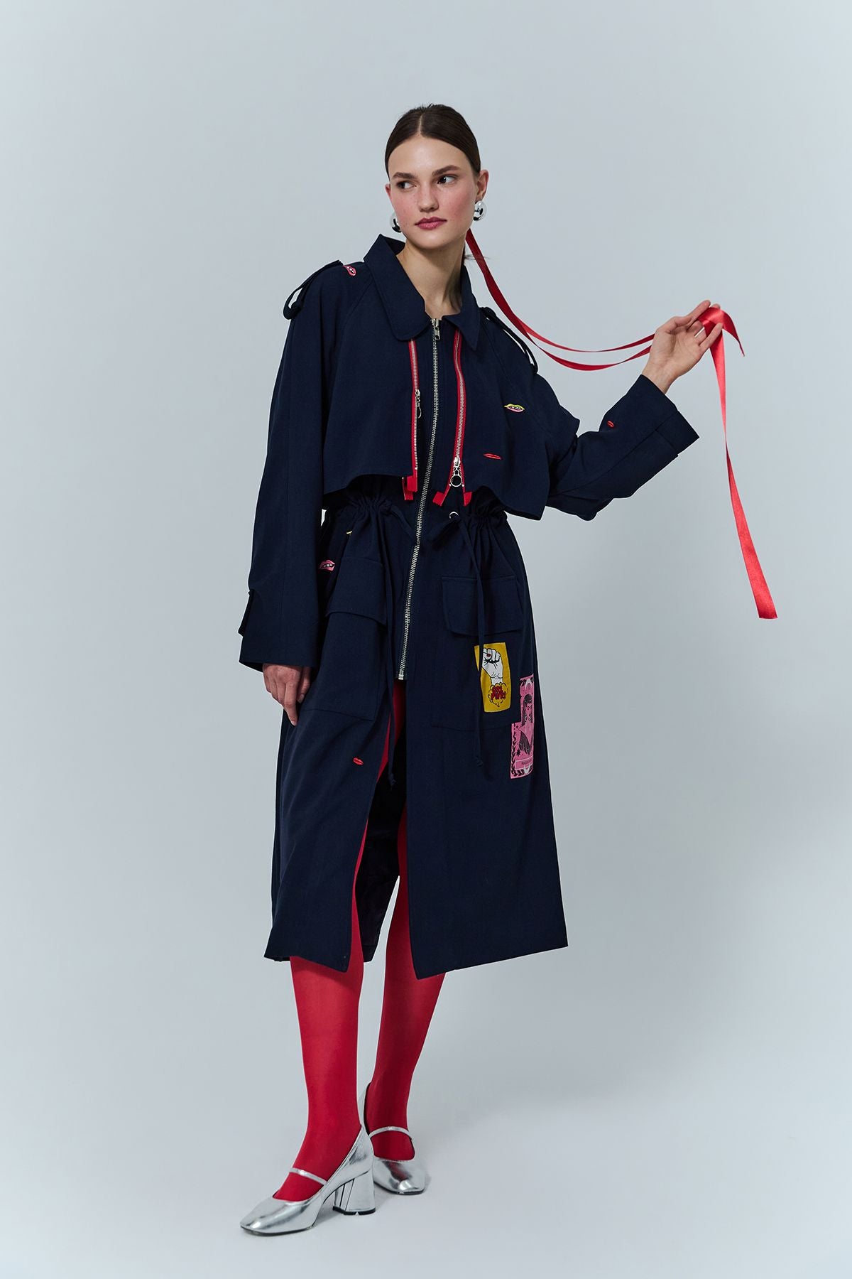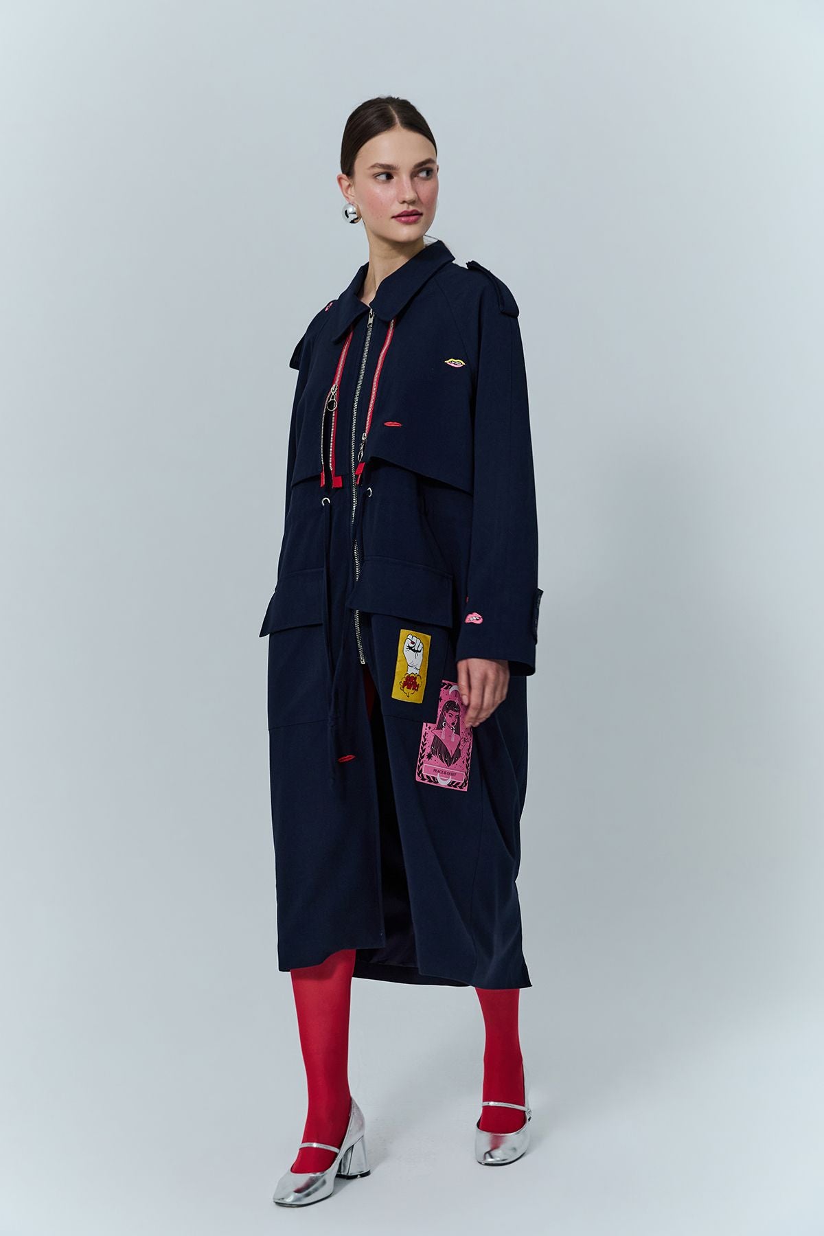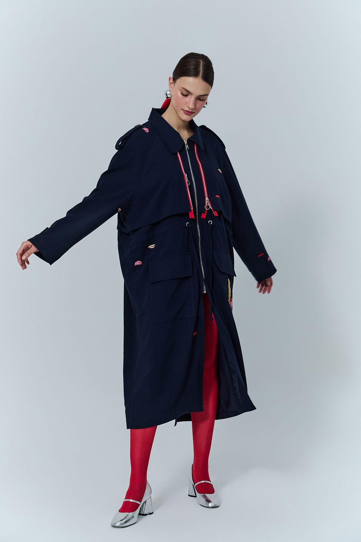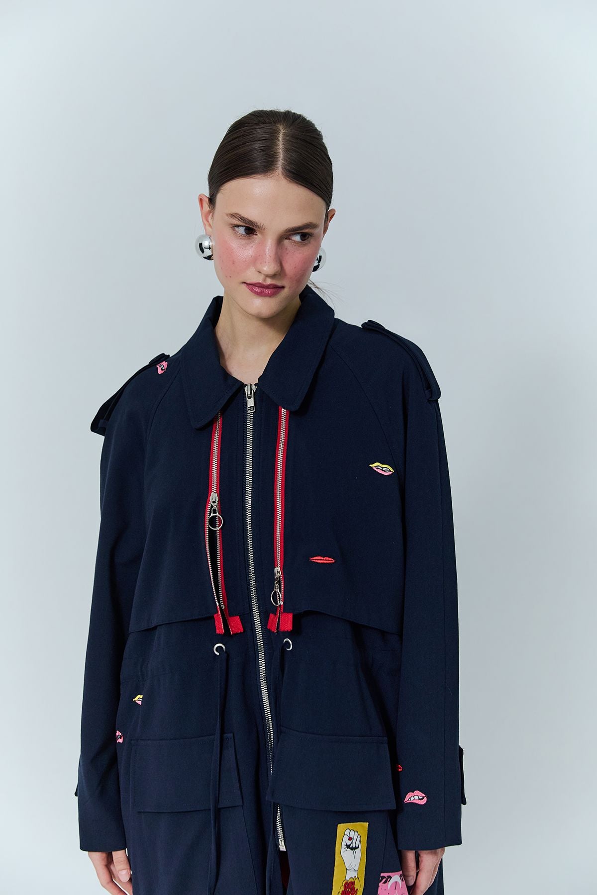 Nakış Detaylı Fermuarlı Uzun Treçkot Lacivert