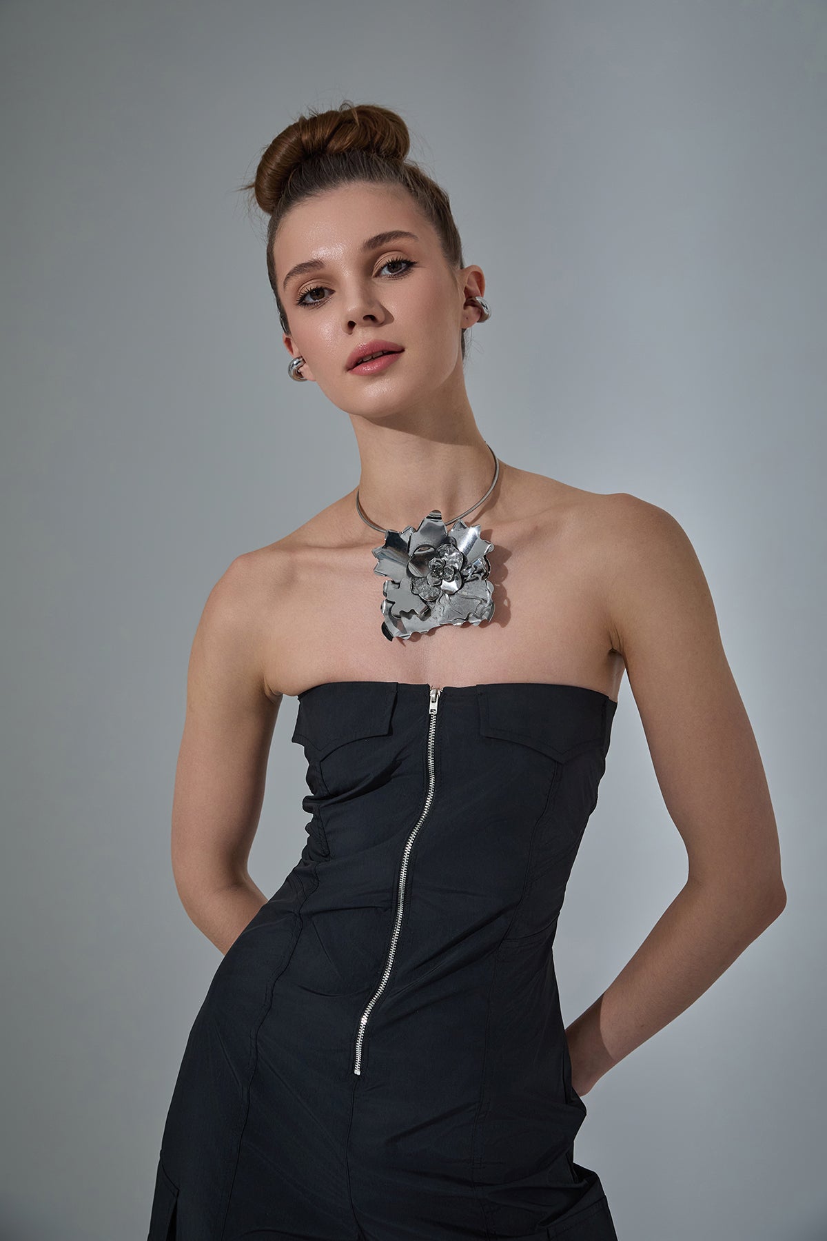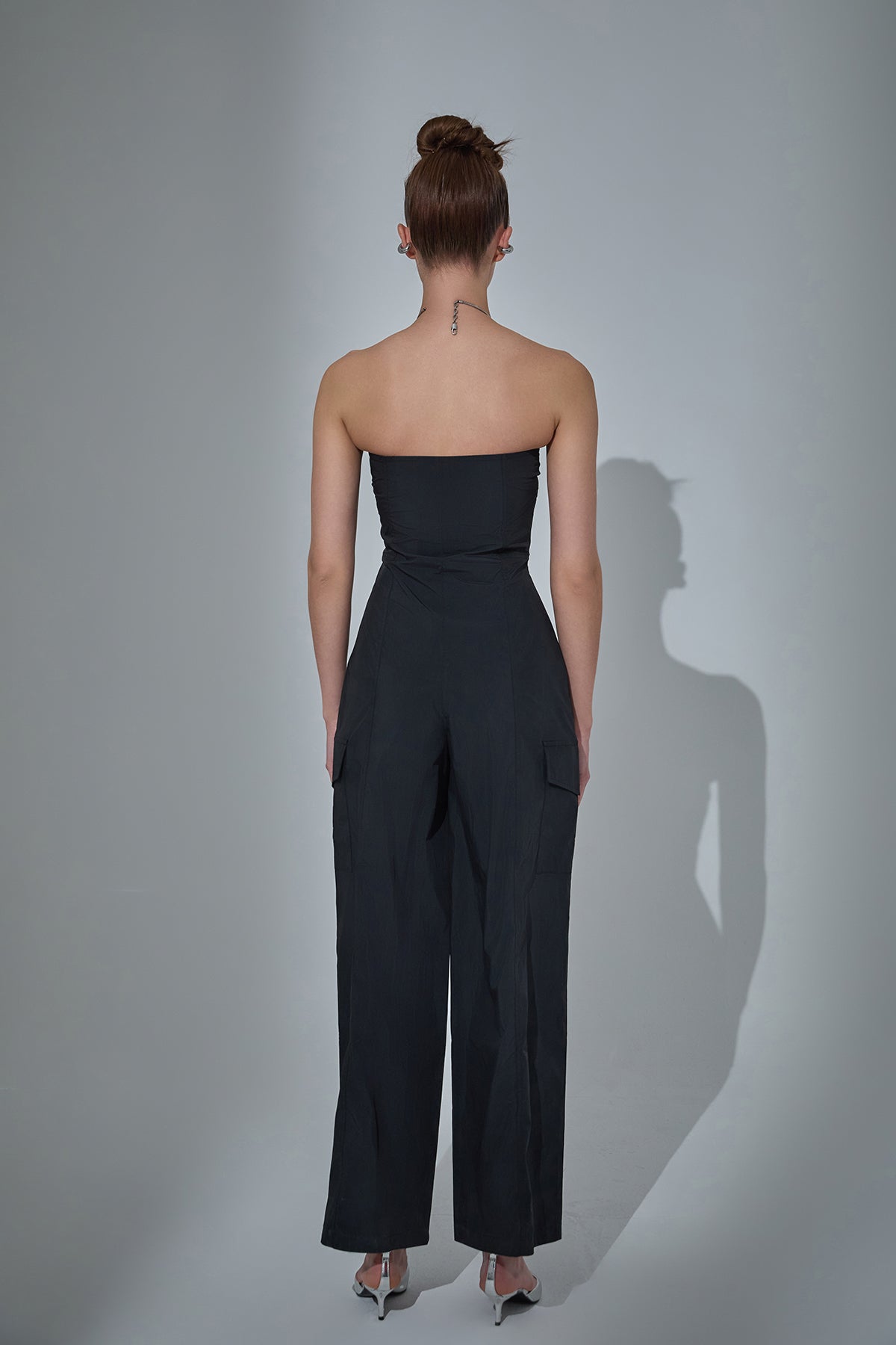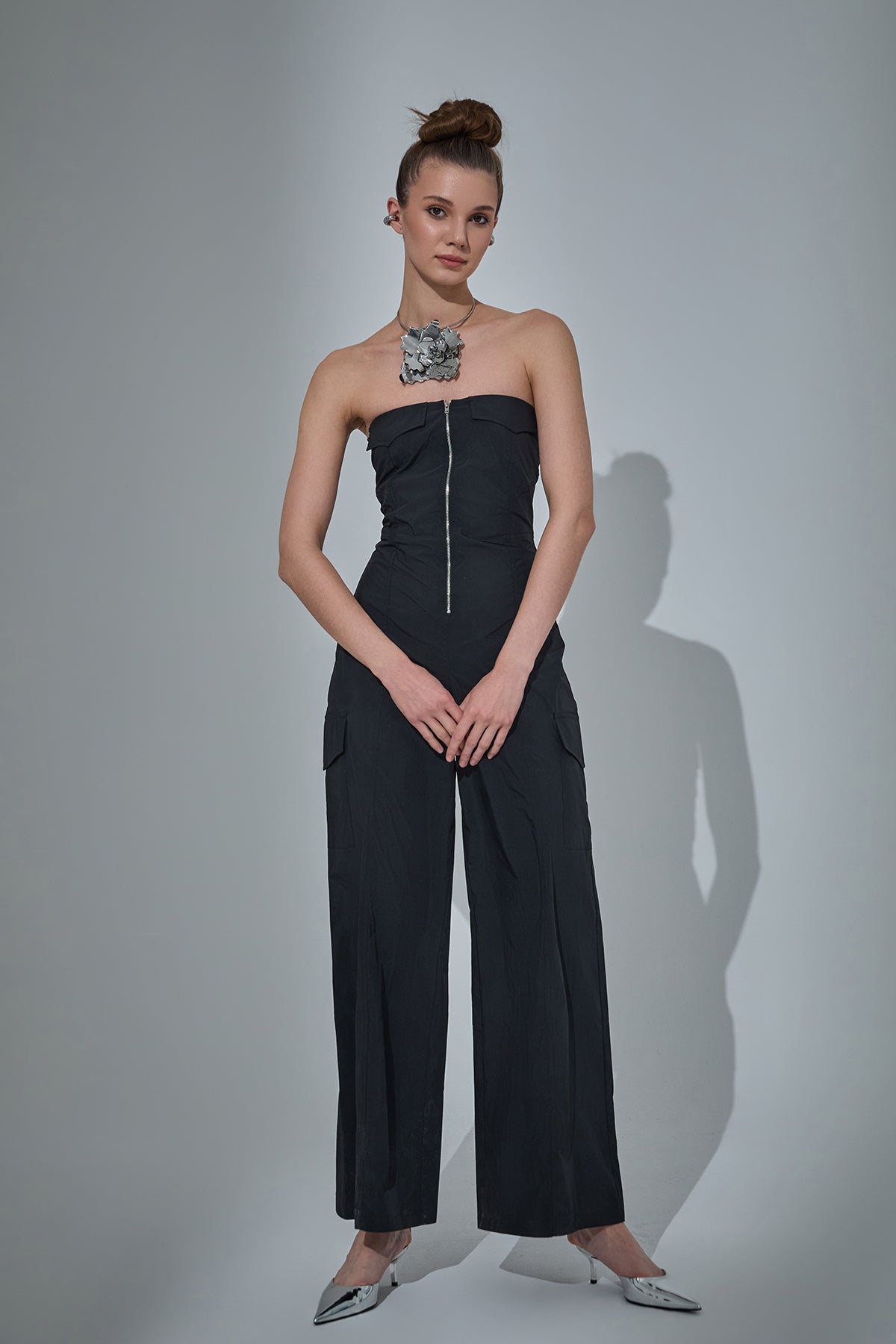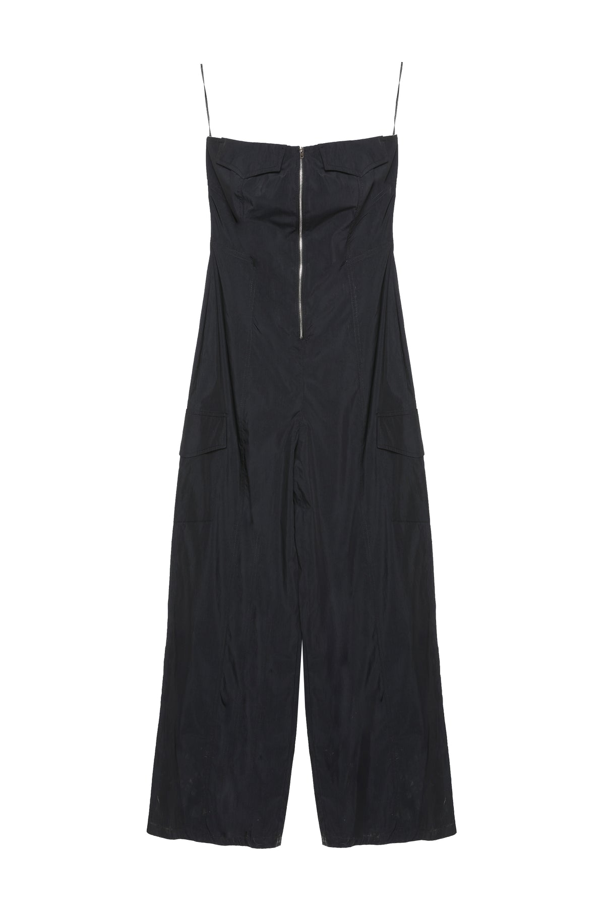 önden fermuar detaylı, straplez, genİş paça, teknİk kumaş tulum.