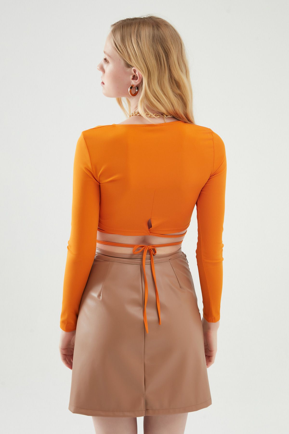 You can present a more feminine look in your style with the design of the crop blouse model that leaves the waist and collar exposed. You can wrap the waist of the long sleeve blouse model as you wish with the lacing detail.