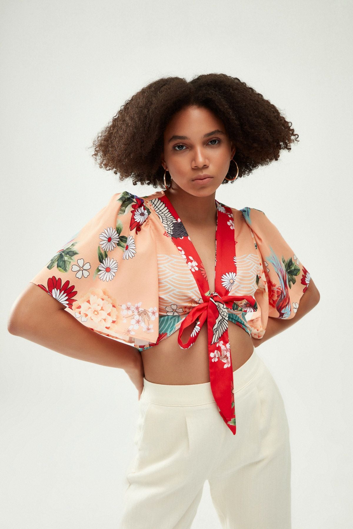Patterned crop blouse with adjustable front tie detail and wide sleeve cut. There is a drawstring detail on the shoulder detail.