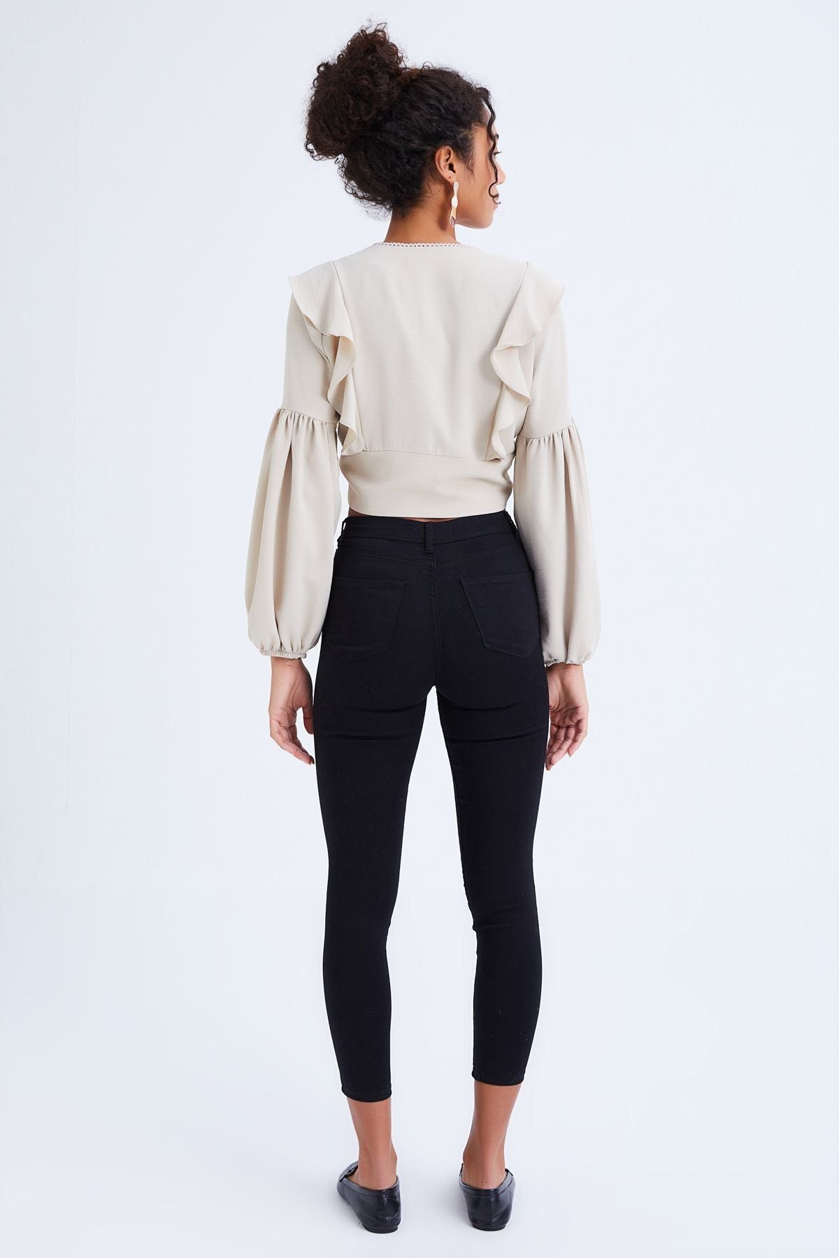V-neck ruffled blouse with buttons on the front, which can be a pleasant alternative whenever you want to look good, spreads sparkle around it with its flowing fabric selection. You can complete your blouse with Quzu skinny trousers, and you can combine it with Quzu skirts for your night style.