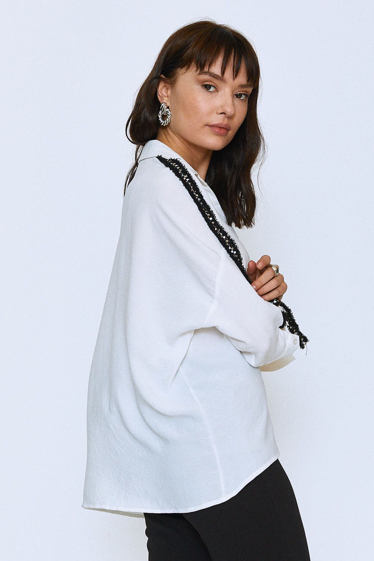 Striped Sleeves V-Neck Shirt Ecru