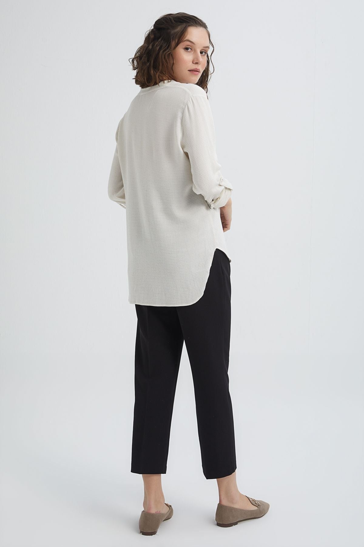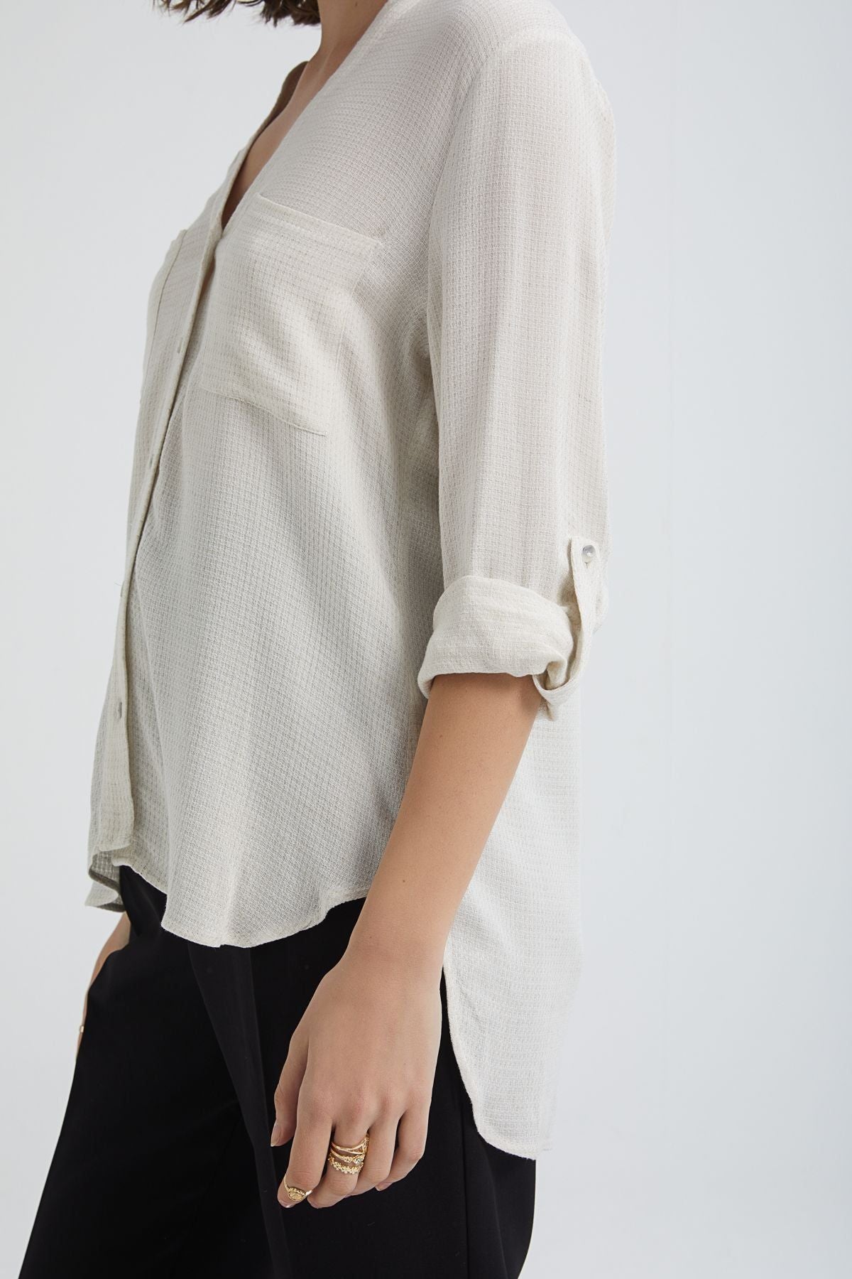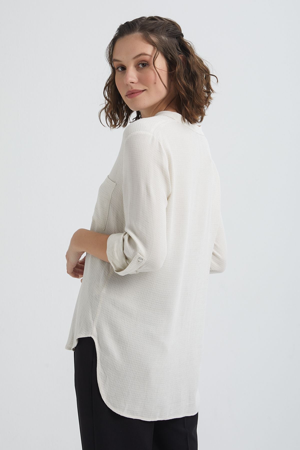 The three-quarter sleeve pocket shirt, which will be a pleasant alternative for your daily choices or casual office style, increases the dose of comfort a little more with its v-neck.