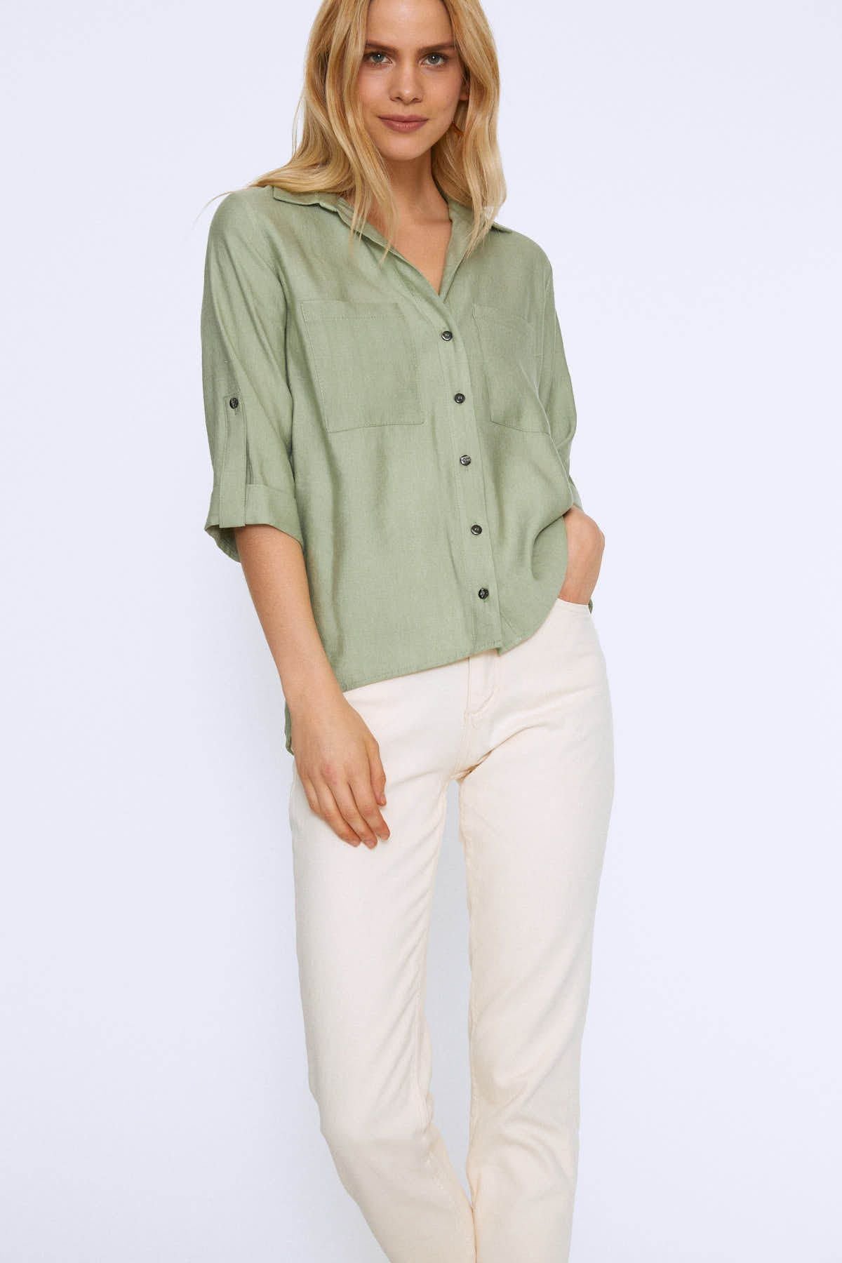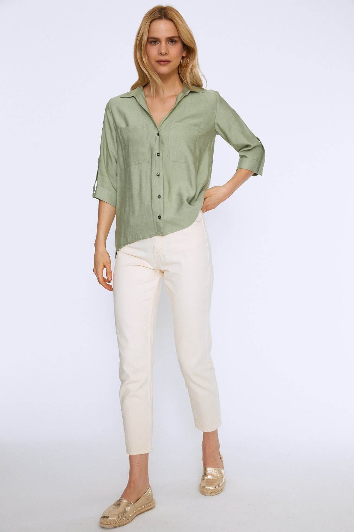 The v-neck blouse with pockets, which guarantees comfort with its soft fabric, brings a modern look with its three-quarter sleeve. You can choose the blouse with high waist skinny pants.