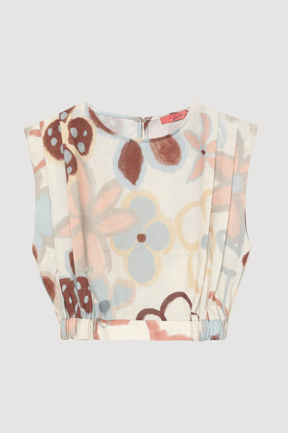 Renkli çiçek desenli, bisiklet yaka, vatkalı omuz detaylı, arkadan düğme kapamalı, omuzları pile detaylı, beli lastikli, astarsız, crop boy keten bluz.