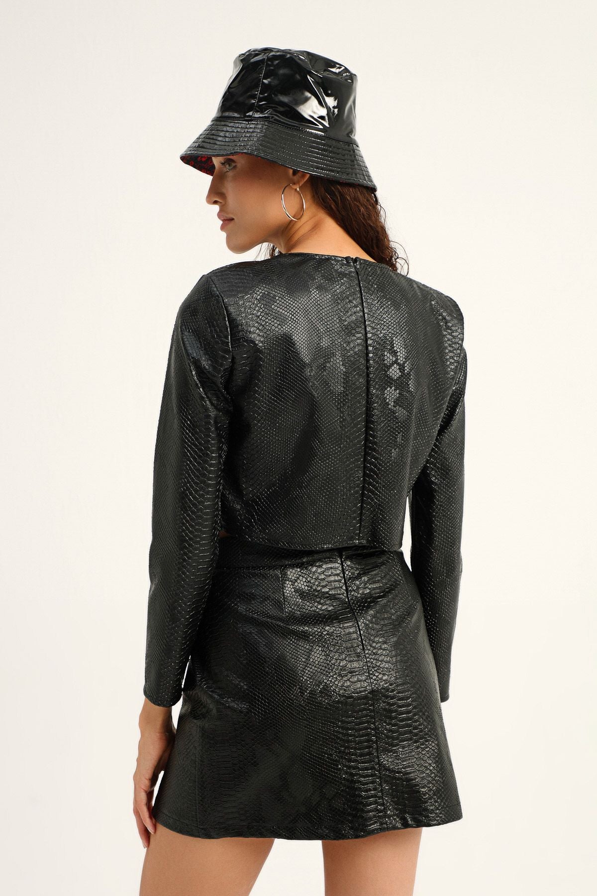 Get ready to rediscover the indispensable snakeskin texture of eye-catching and perfect combinations with a padded cropped leather blouse! Let this blouse and complementary skirt be accompanied by loafers or booties, which is a heart-stealer! If you want a crop vegan leather blouse model that you will strengthen with your accessories, buy it before it runs out!