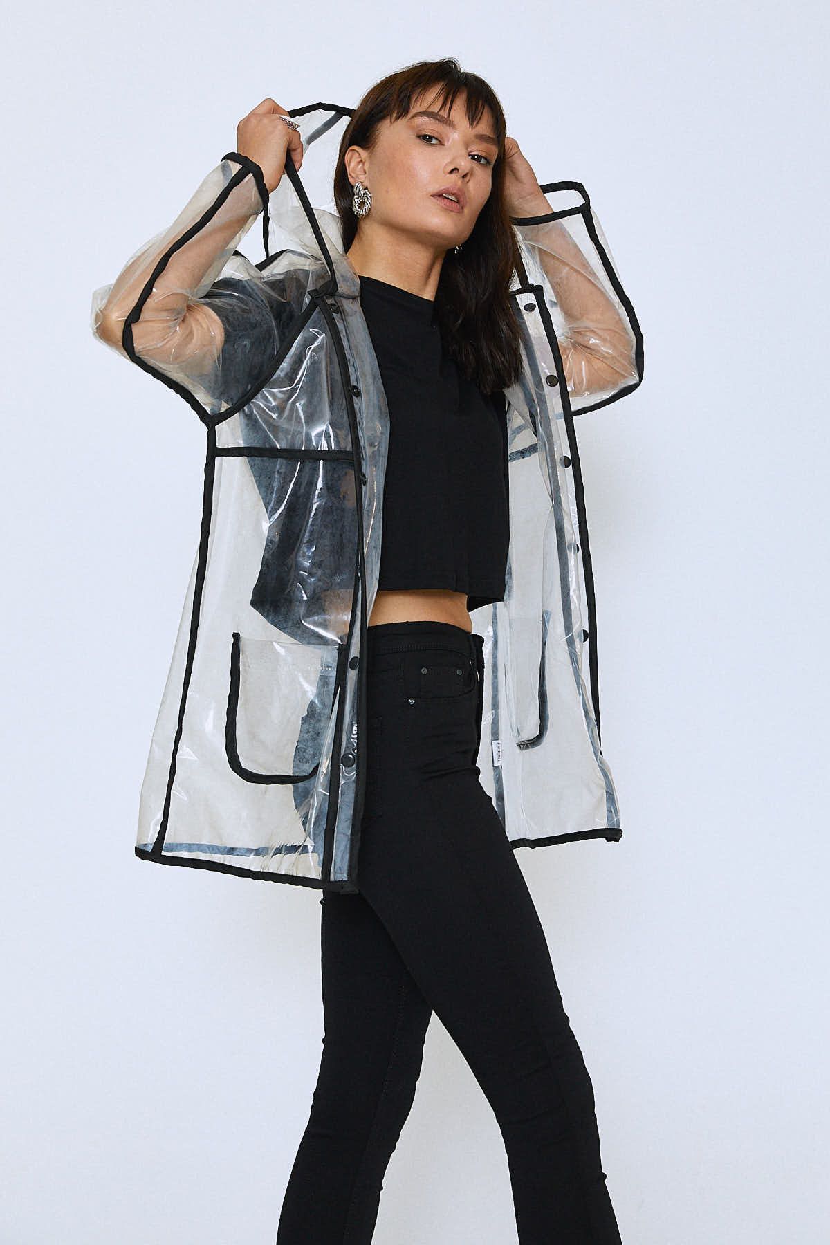 Transparent hooded raincoat adds a new dimension to fashion. Being a star piece without getting ahead of the day's outfit is just for her.