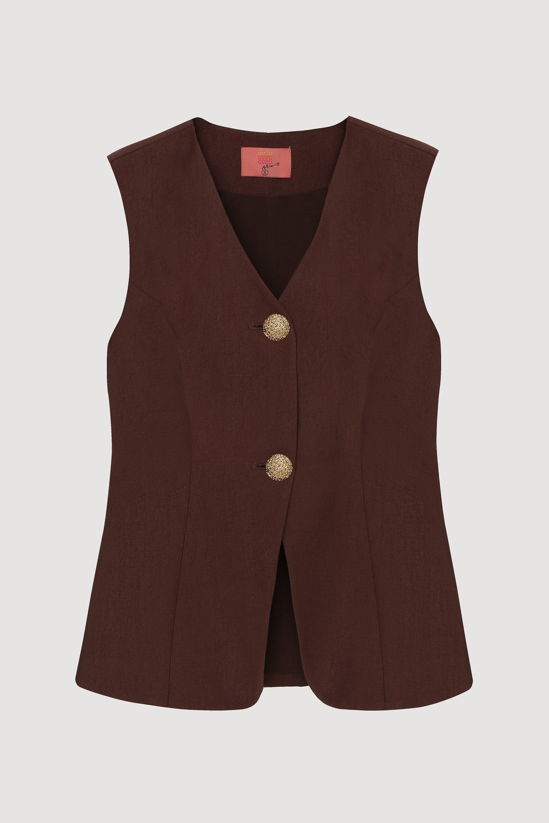 İçi astarlı, v yaka, gold rengi düğme detaylı, kolsuz, uzun yelek ceket.