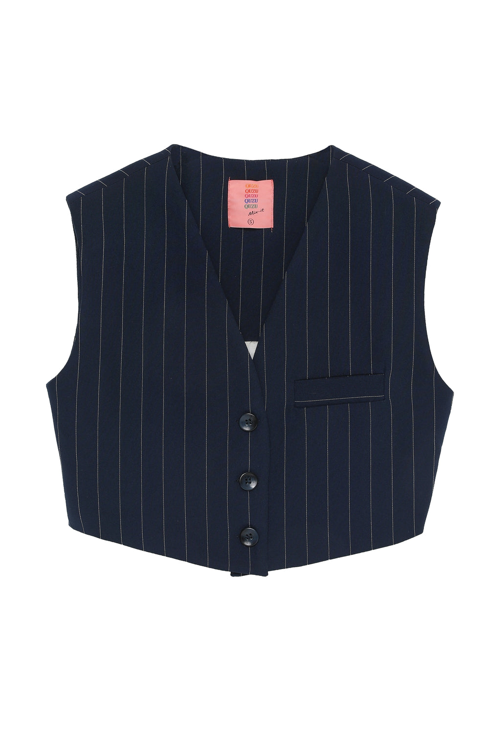 Short, button-up vest jacket with pinstripe details.
