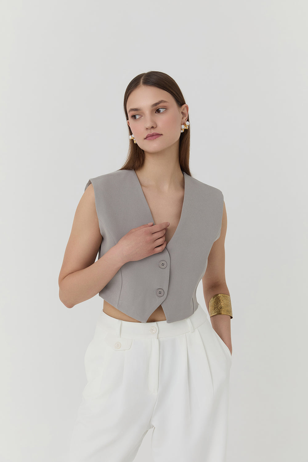Düğme Detaylı Kısa Yelek Ceket Gri