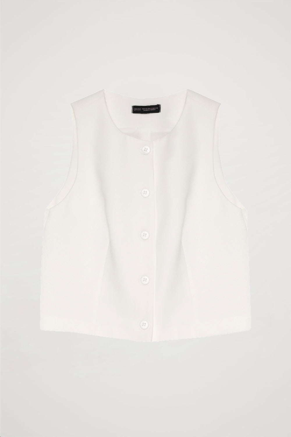 İçi astarlı, kolsuz, düğme kapamalı, yuvarlak yakalı, kısa boy, zarif ve modern tasarımlı şık yelek ceket.