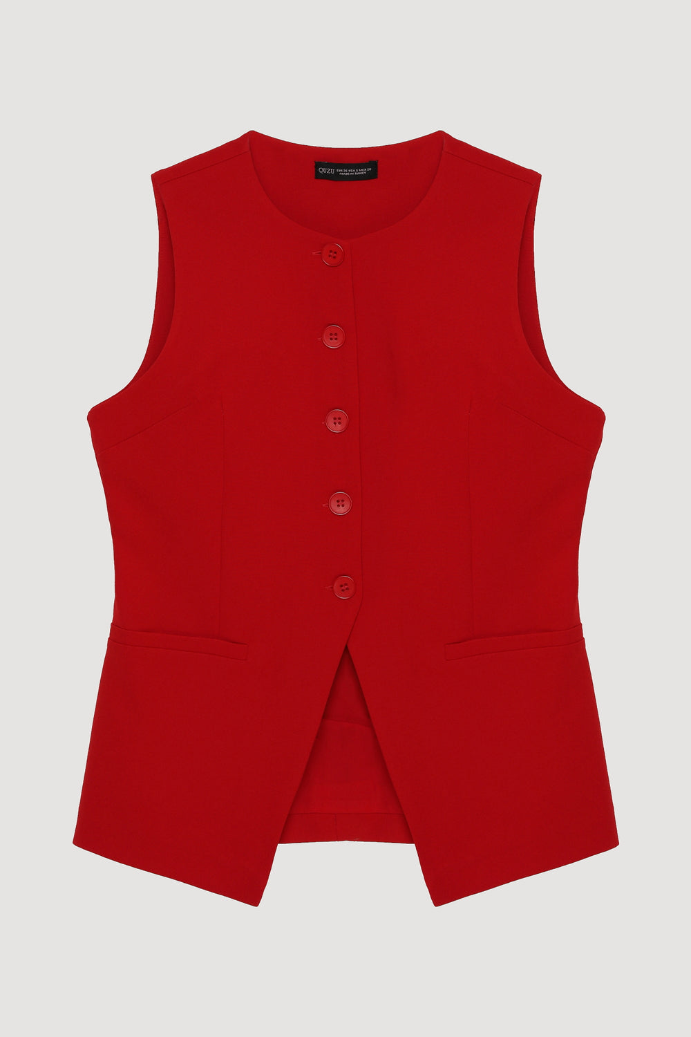 Düğmeli V Kesim Kolsuz Yelek Kırmızı