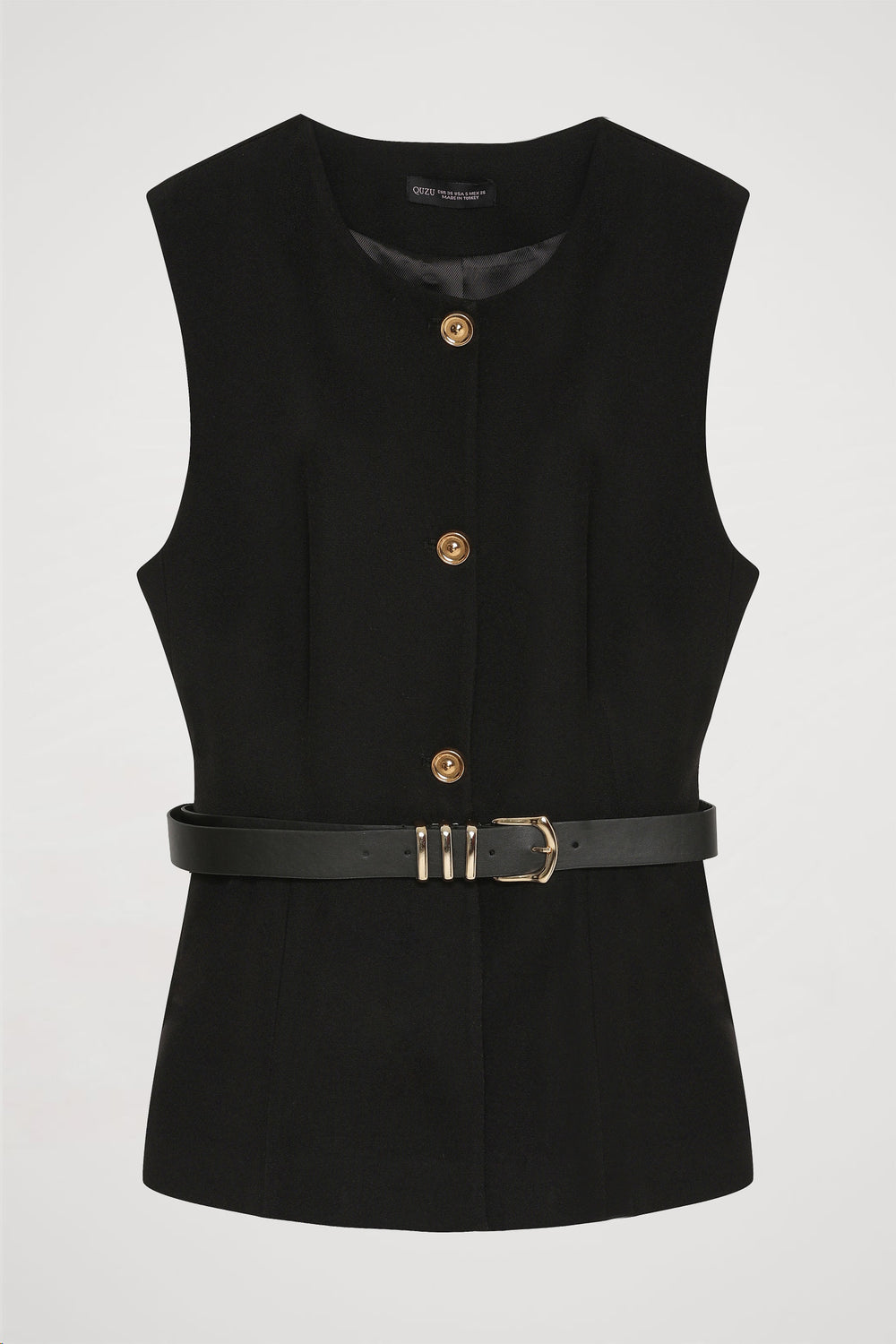 Kemer Aksesuarlı Düğmeli Kolsuz Yelek Siyah