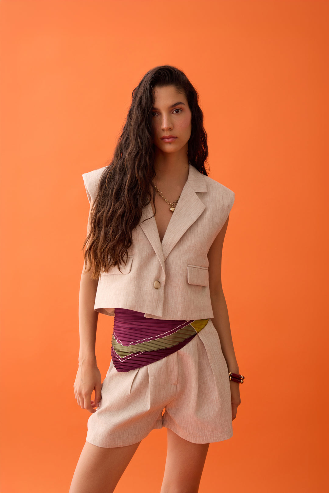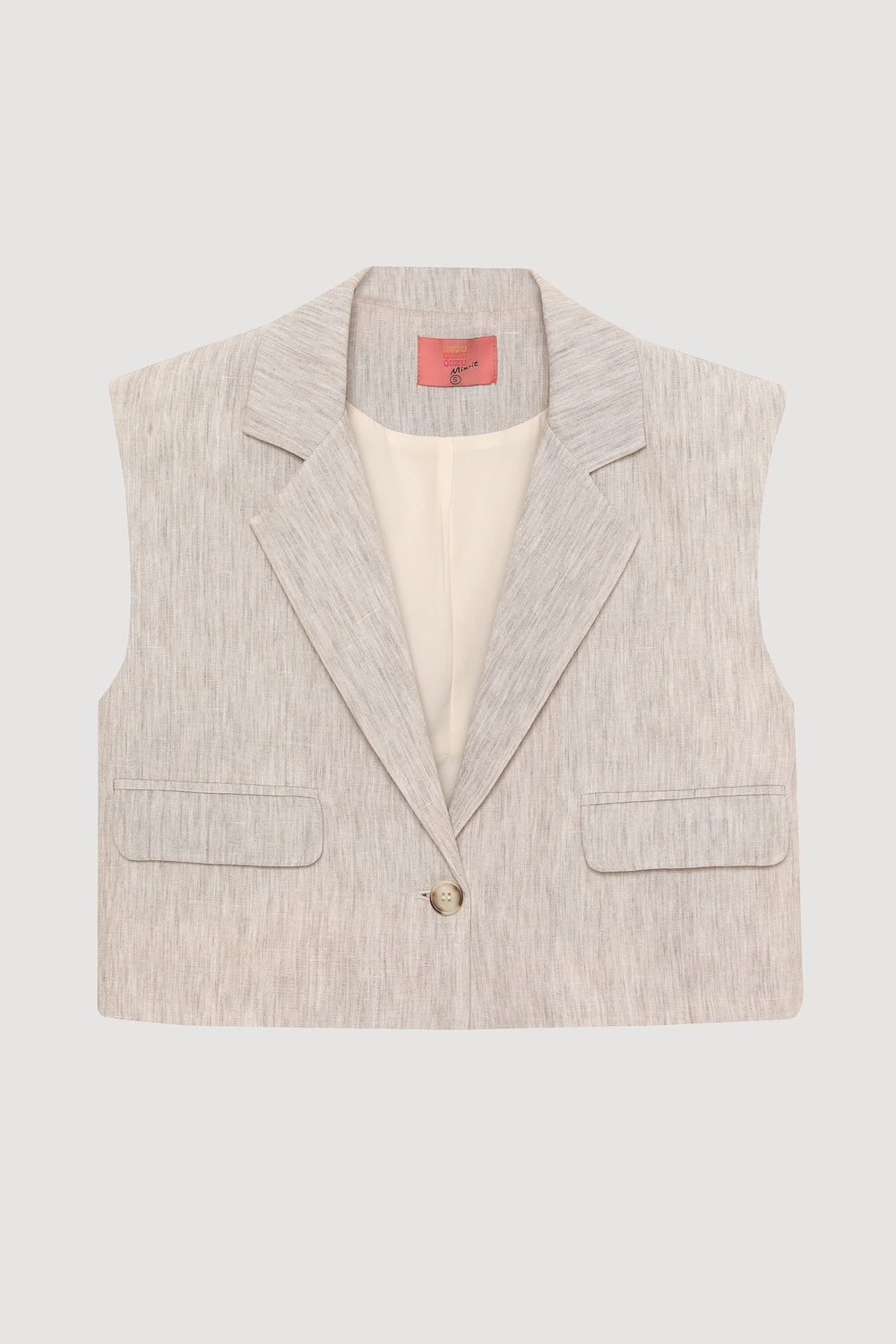 İçi kendi renginden astarlı, kolsuz, gömlek yaka detaylı, tek düğmeli, cep kapaklı, kısa yelek.