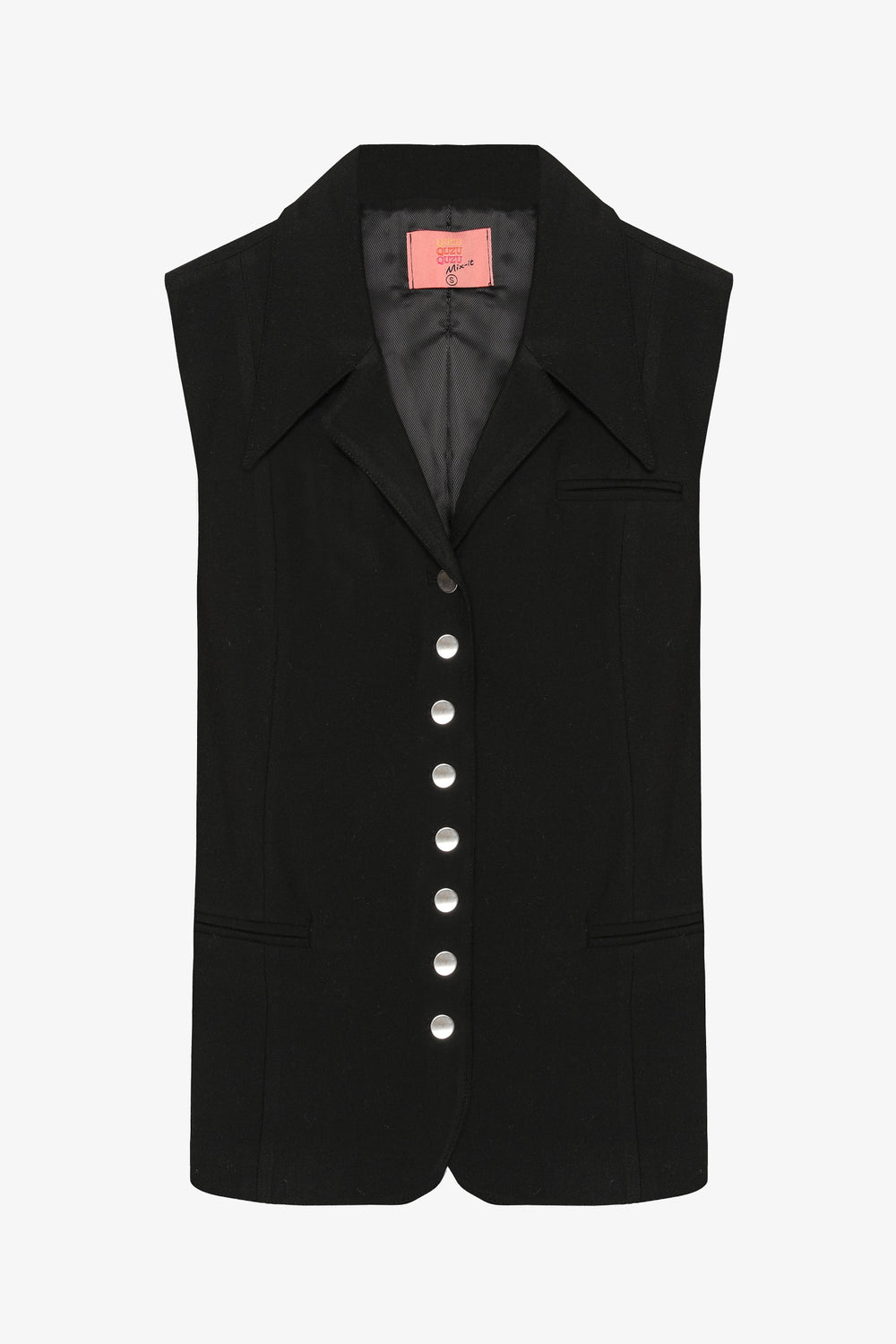Önü metal düğmeli, geniş yaka detaylı, cepli, içi astarlı, arkası kuşak bağlamalı, slim kesim, kolsuz yelek ceket.