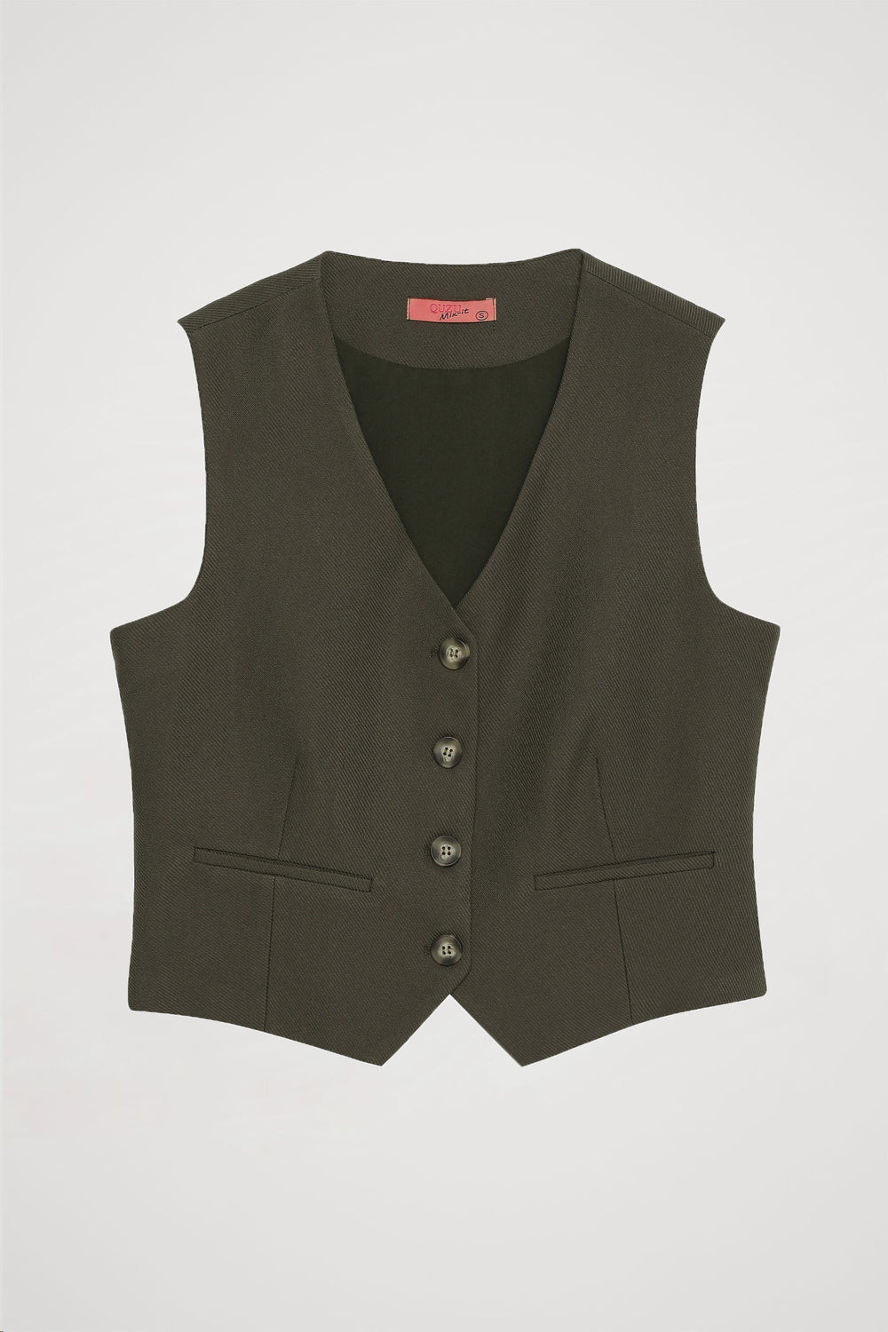 İçi kendi renginden astarlı, v yaka, düğme kapamalı, cep detaylı, zarif ve modern görünüm sunan kolsuz yelek ceket.