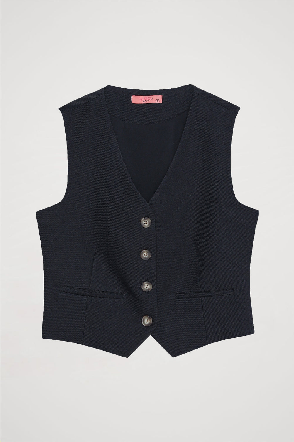 İçi kendi renginden astarlı, v yaka, düğme kapamalı, cep detaylı, zarif ve modern görünüm sunan kolsuz yelek ceket.