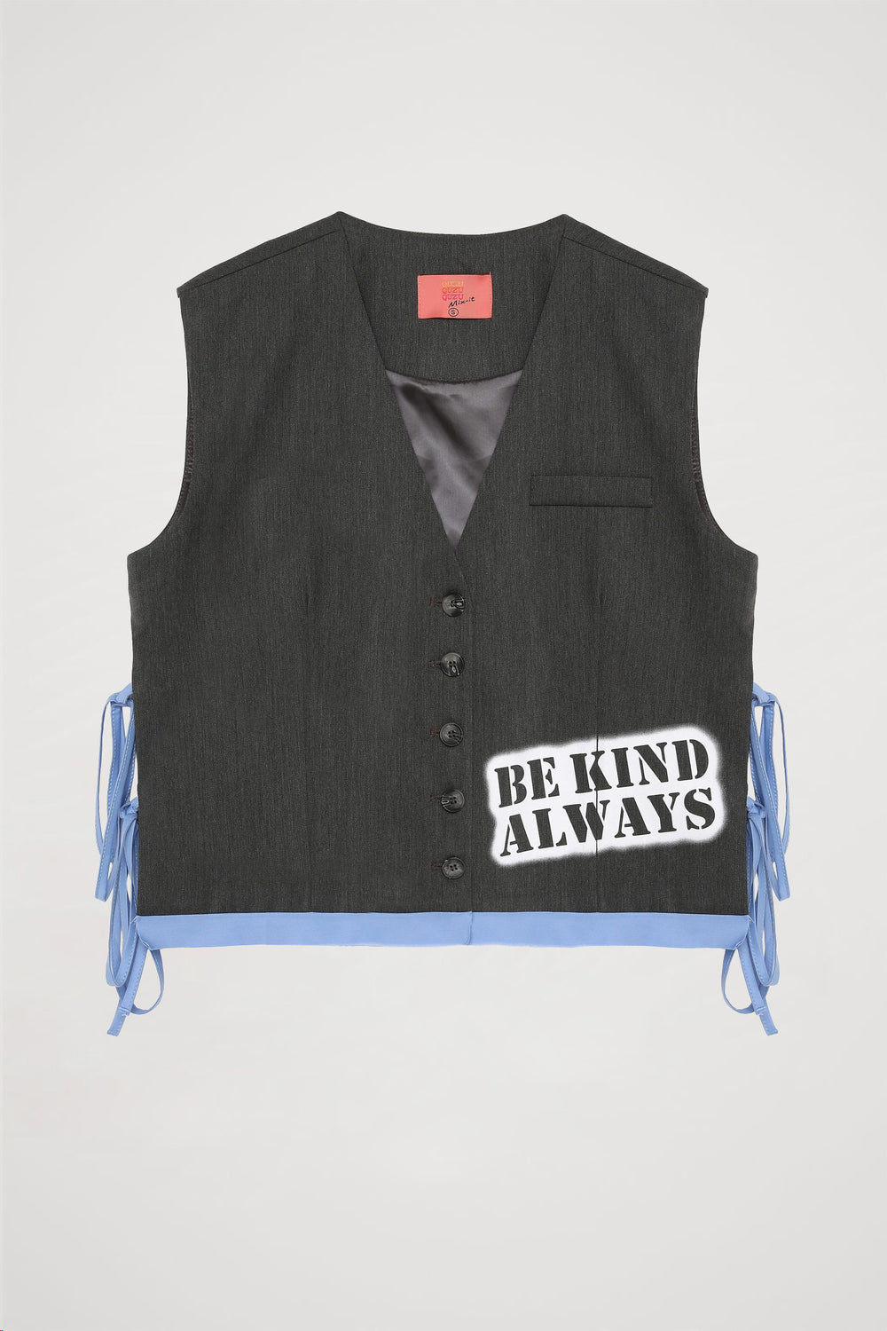 Yanları fiyonk bağcık detaylı, düğme kapamalı, "be kınd always" yazı baskılı, içi astarlı, kumaş matchli yelek.