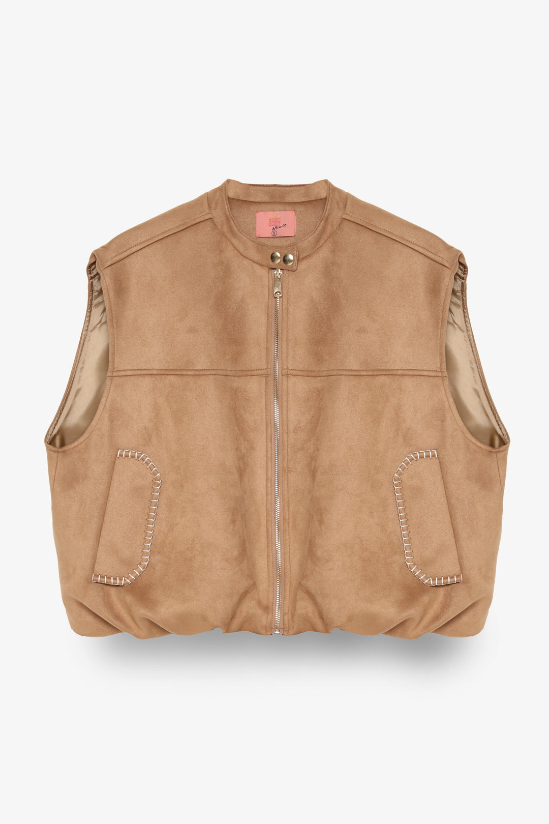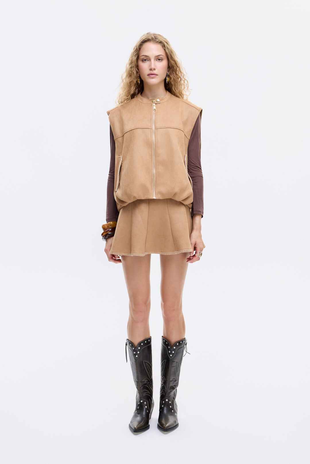Zikzak Dikiş Detaylı Beli Lastikli Süet Görünümlü Yelek Bej