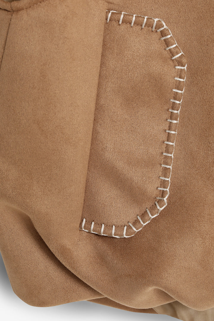İçi kendi renginden astarlı, bisiklet yaka, beli lastikli, yakası çıt çıtlı, fermuar kapamalı, cebi kontrast zikzak dikiş detaylı, düşük kol, süet görünümlü yelek.