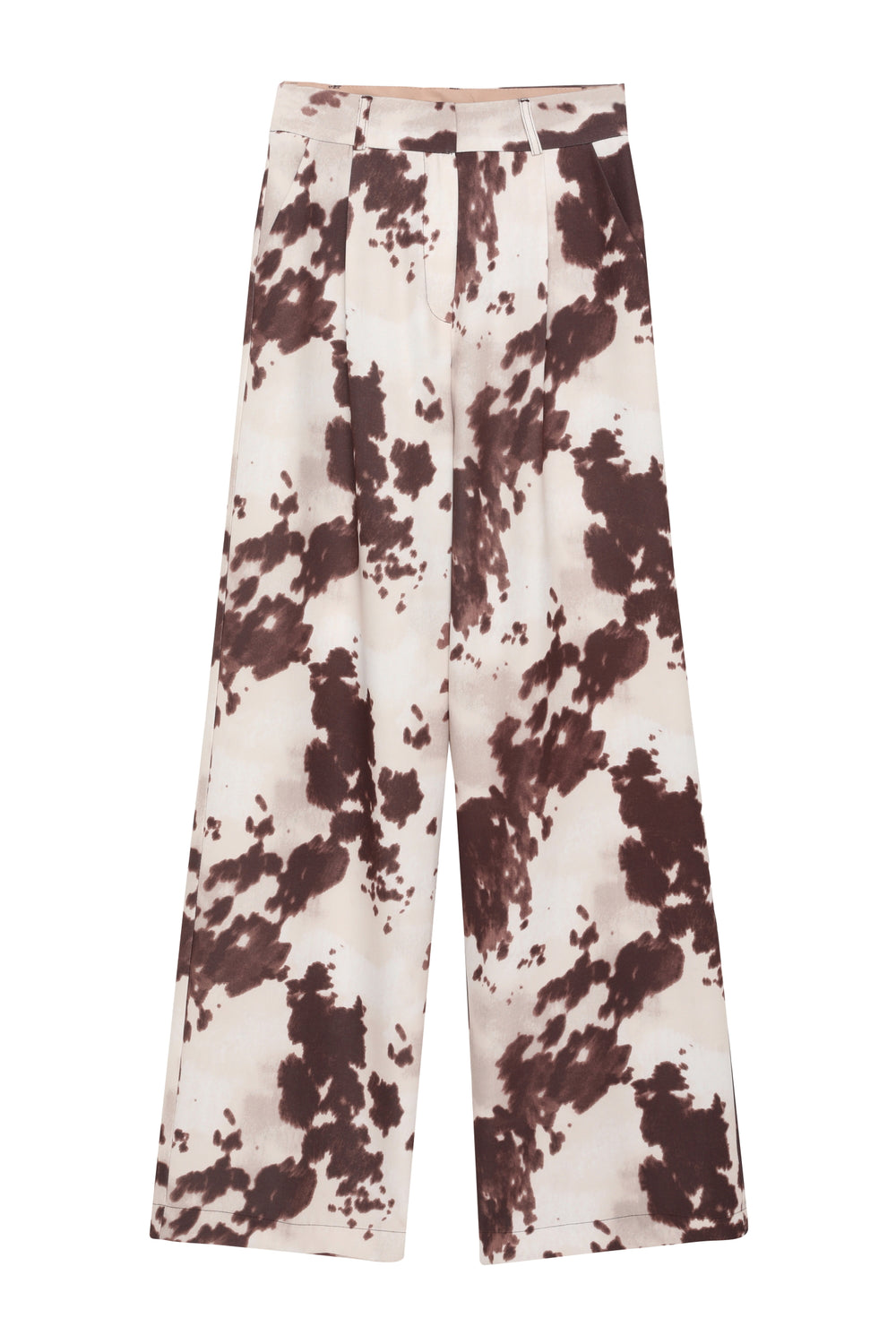 İnek Desenli Yüksek Bel Bol Paça Pantolon Kahverengi