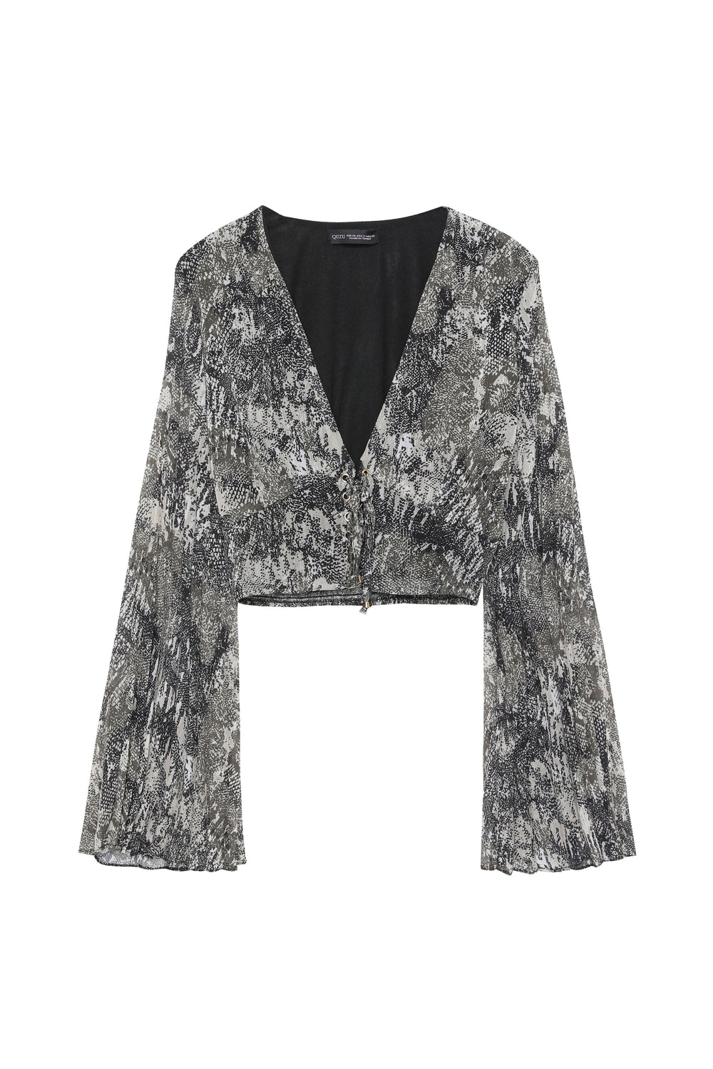 Derin V yakalı, bağlama detaylı, beli gipeli, uzun tül kollu, desenli crop bluz.
