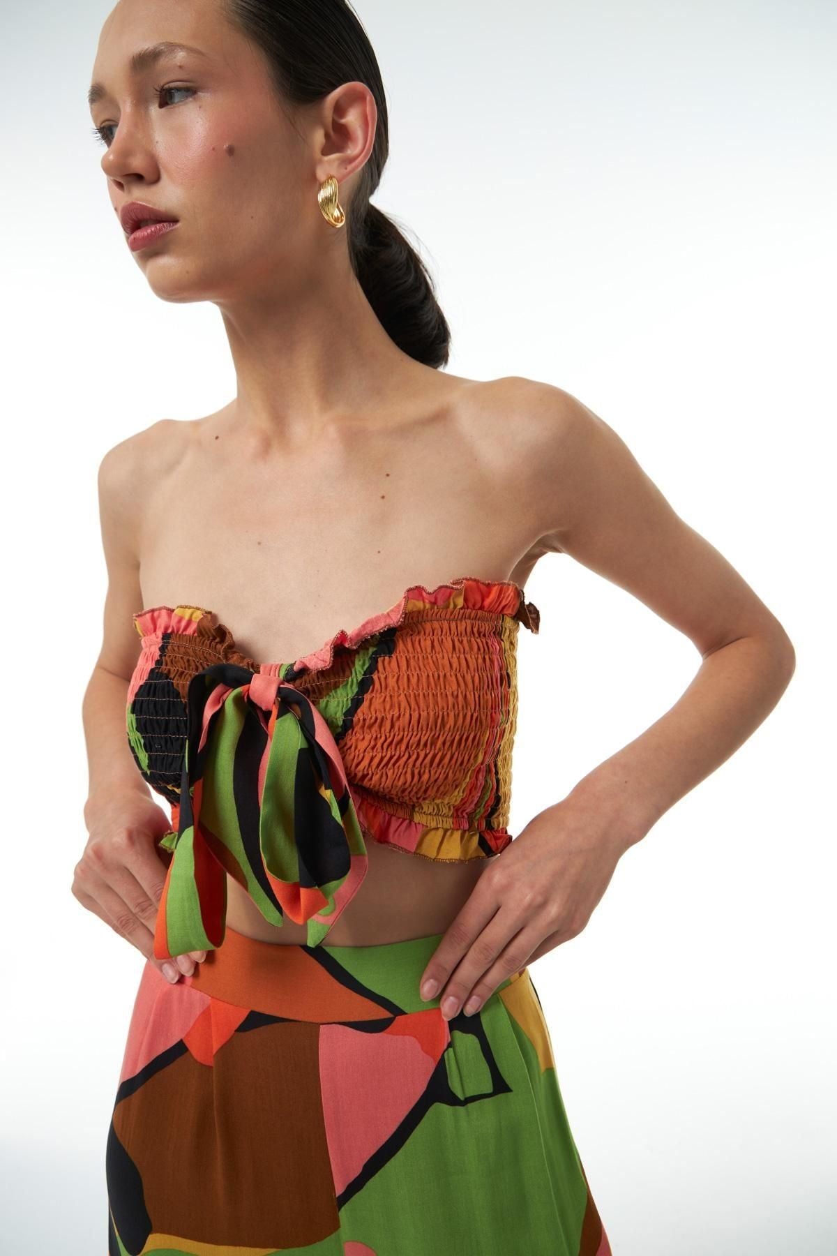 With both its color and design, you can make room in your wardrobe to make the tie-up bustier model a perfect fit for the season. You can achieve harmony with the latest trends by combining the patterned bustier model with the baggy trousers model of the same color and pattern. The strapless bustier model with 100% viscose content is a candidate to be one of your favorite pieces that you can easily combine with other clothes in your wardrobe.