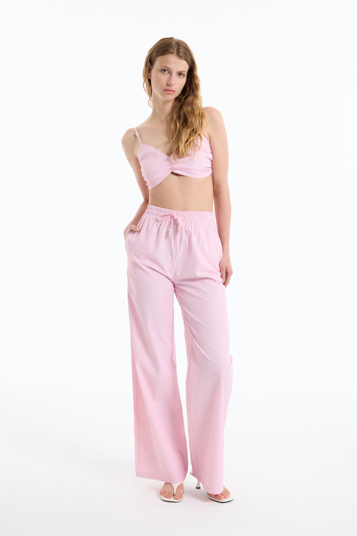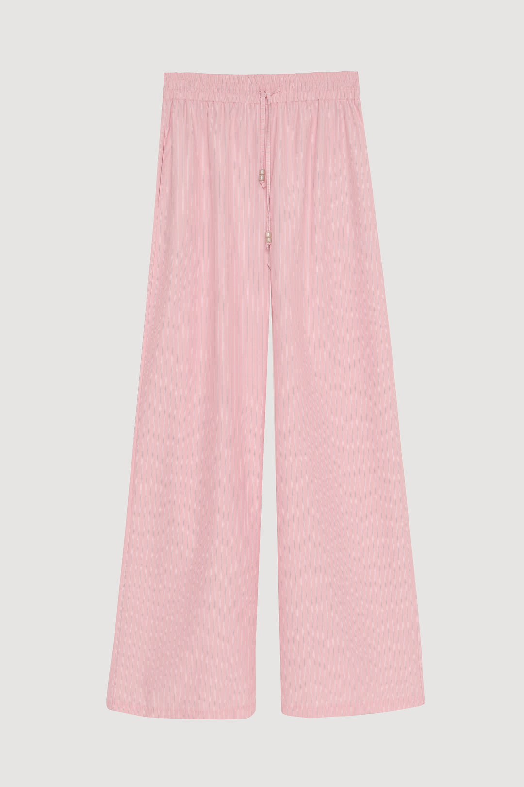İnce çizgili desenli, beli lastikli ve bağcık bağlama detaylı, rahat kalıp, çift cepli, geniş paça pantolon.