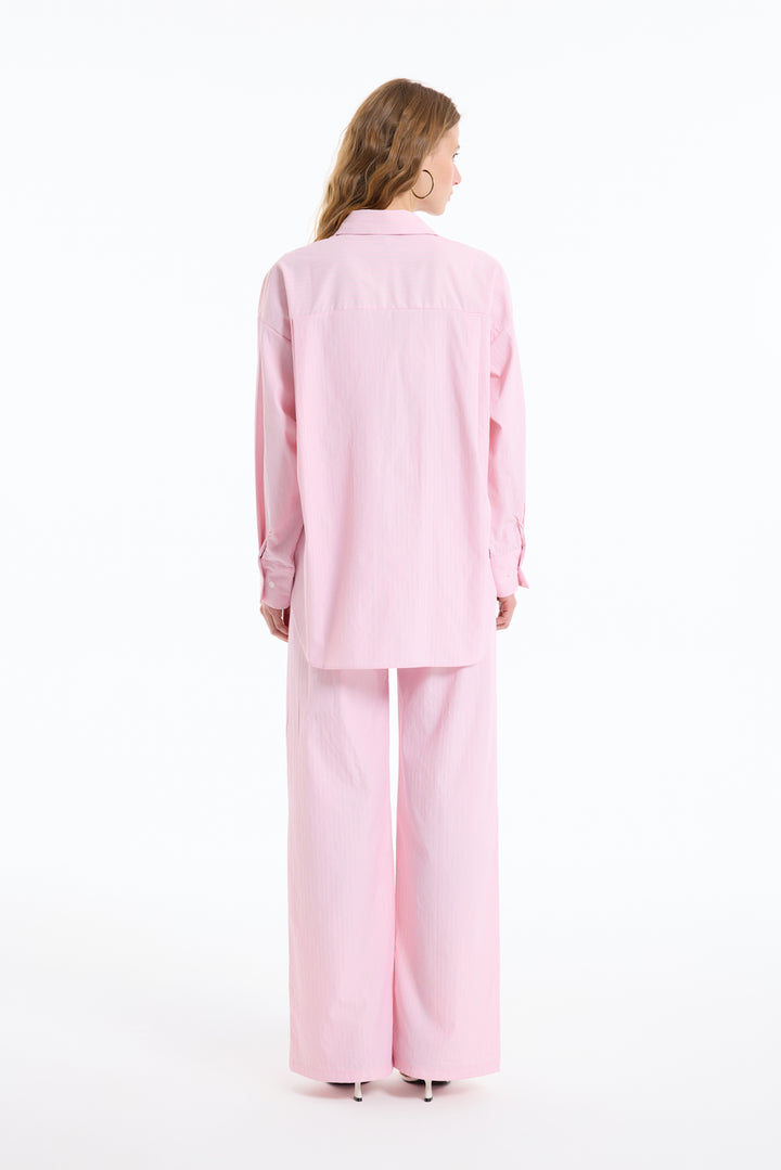 Beli Lastikli İnce Çizgili Geniş Paça Pantolon Pembe