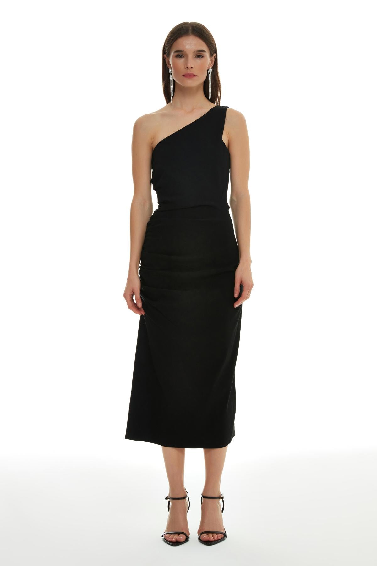 Ruffle Detailed One Shoulder Midi Dress Black