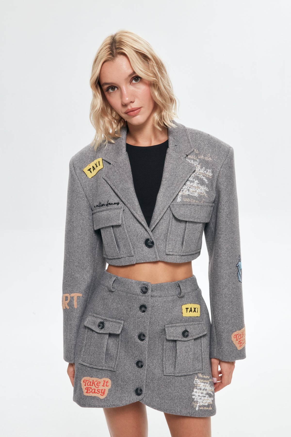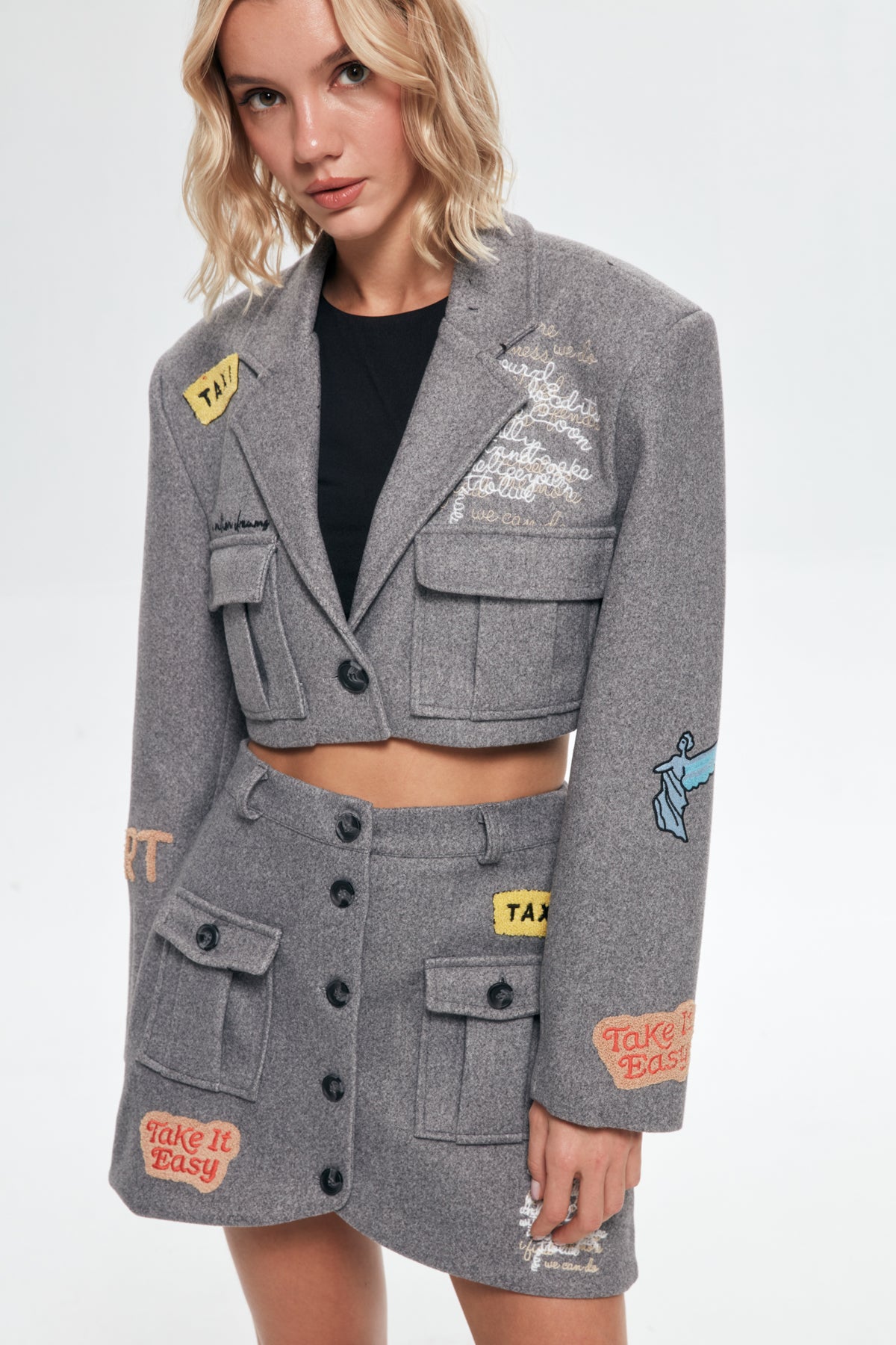 Cep Detaylı Nakışlı Kaşe Crop Ceket Antrasit