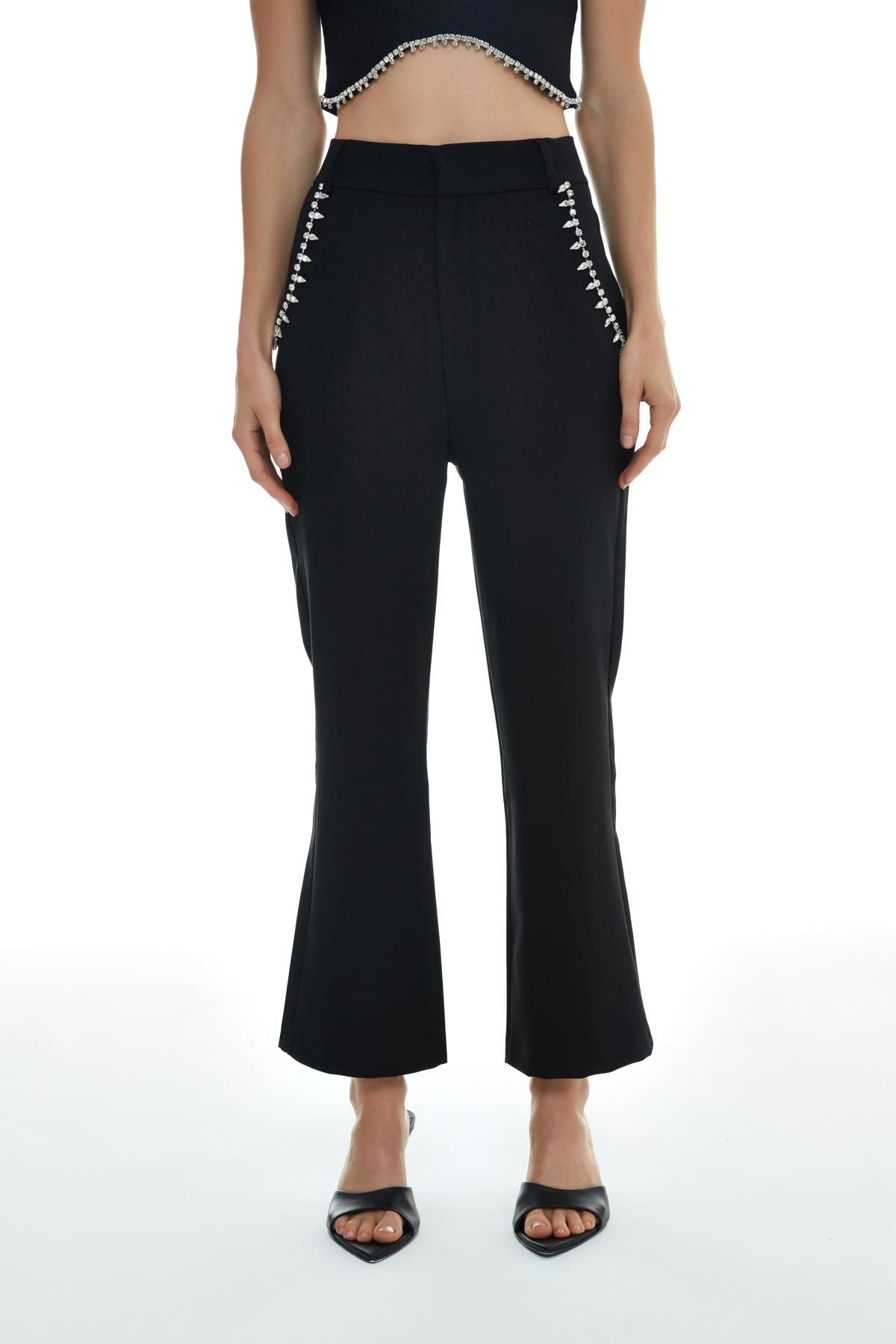 Short-leg trousers with a high waist, concealed hook-and-eye fastening, double pockets, pockets with stone accessories.