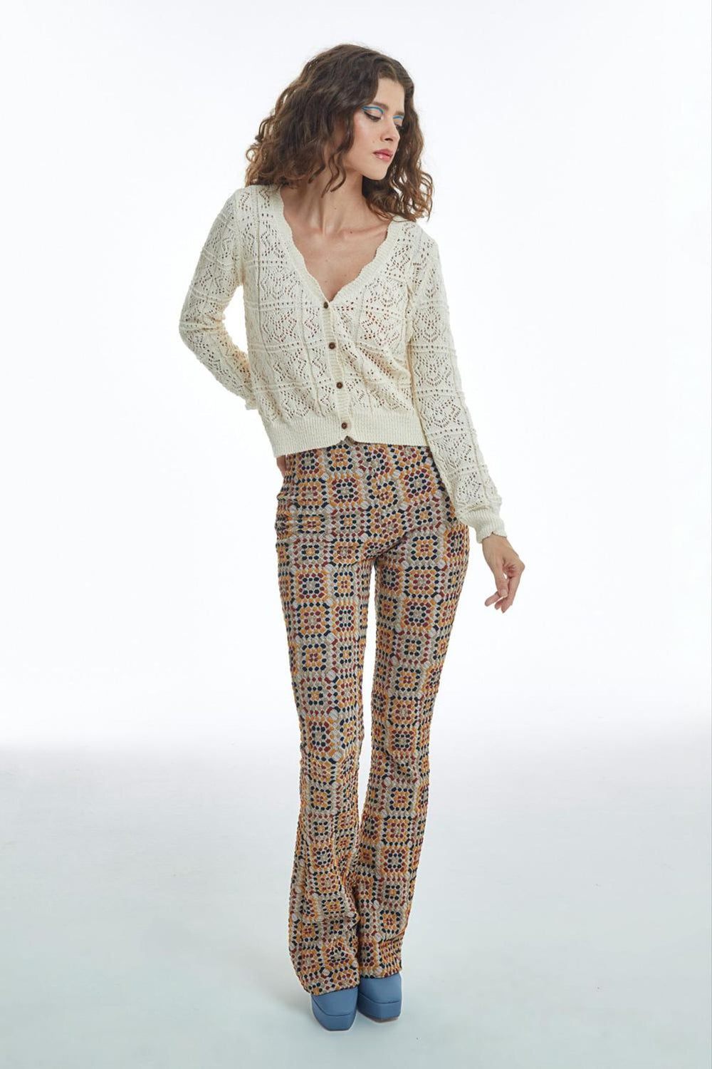 Cropped cardigan with openwork, long sleeves, motif design, deep V-neck, cotton content.