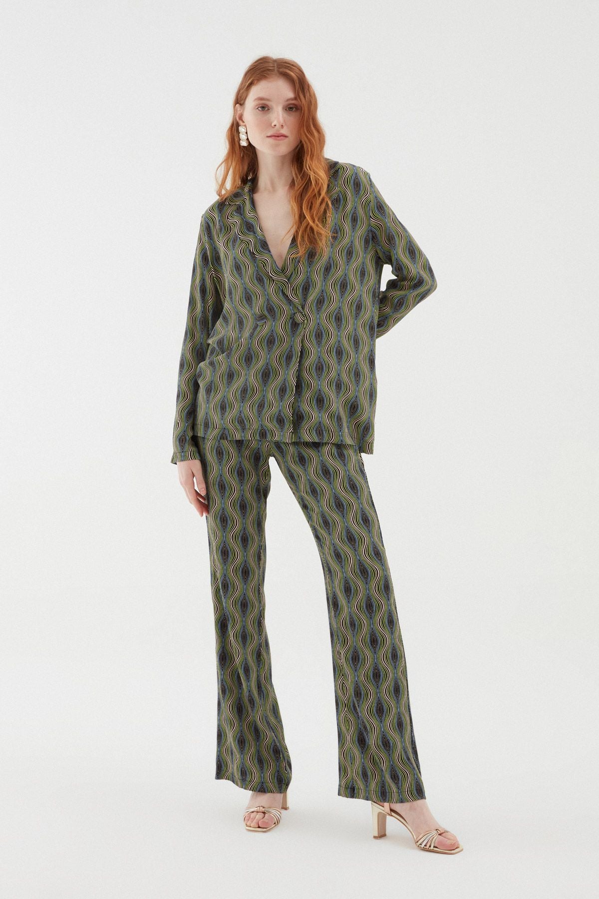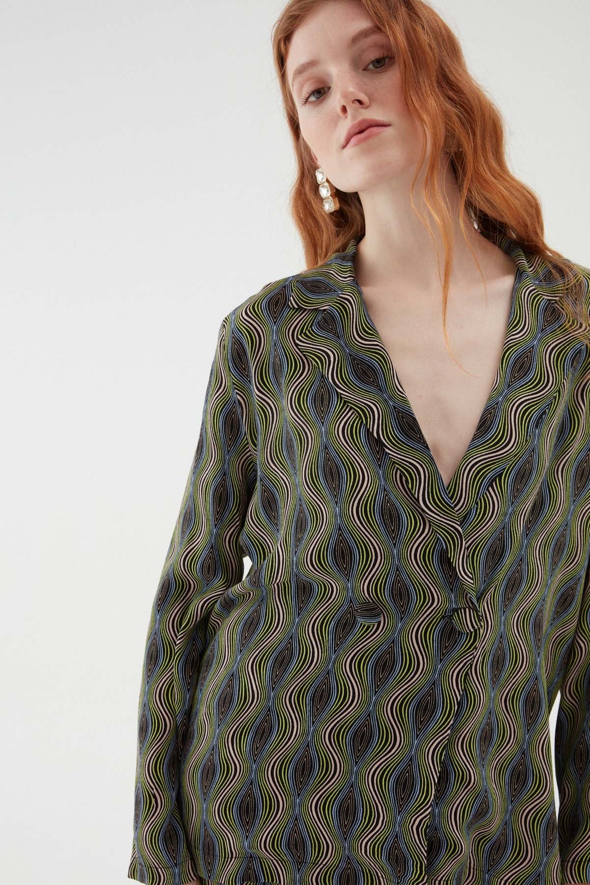 The double-breasted collar detailed shirt model in which you will feel comfortable and very light with its draped stance, creates excitement with its pattern :) Feel light in the summer with the double button detailed patterned shirt model made of your own fabric, which attracts attention with its geometric pattern. The oversize shirt model, with its shabby cut, creates the feeling of not being on it, and provides comfort in its combinations with its light fabric. You can create a team look by choosing our wide leg trousers model in the same color and pattern.