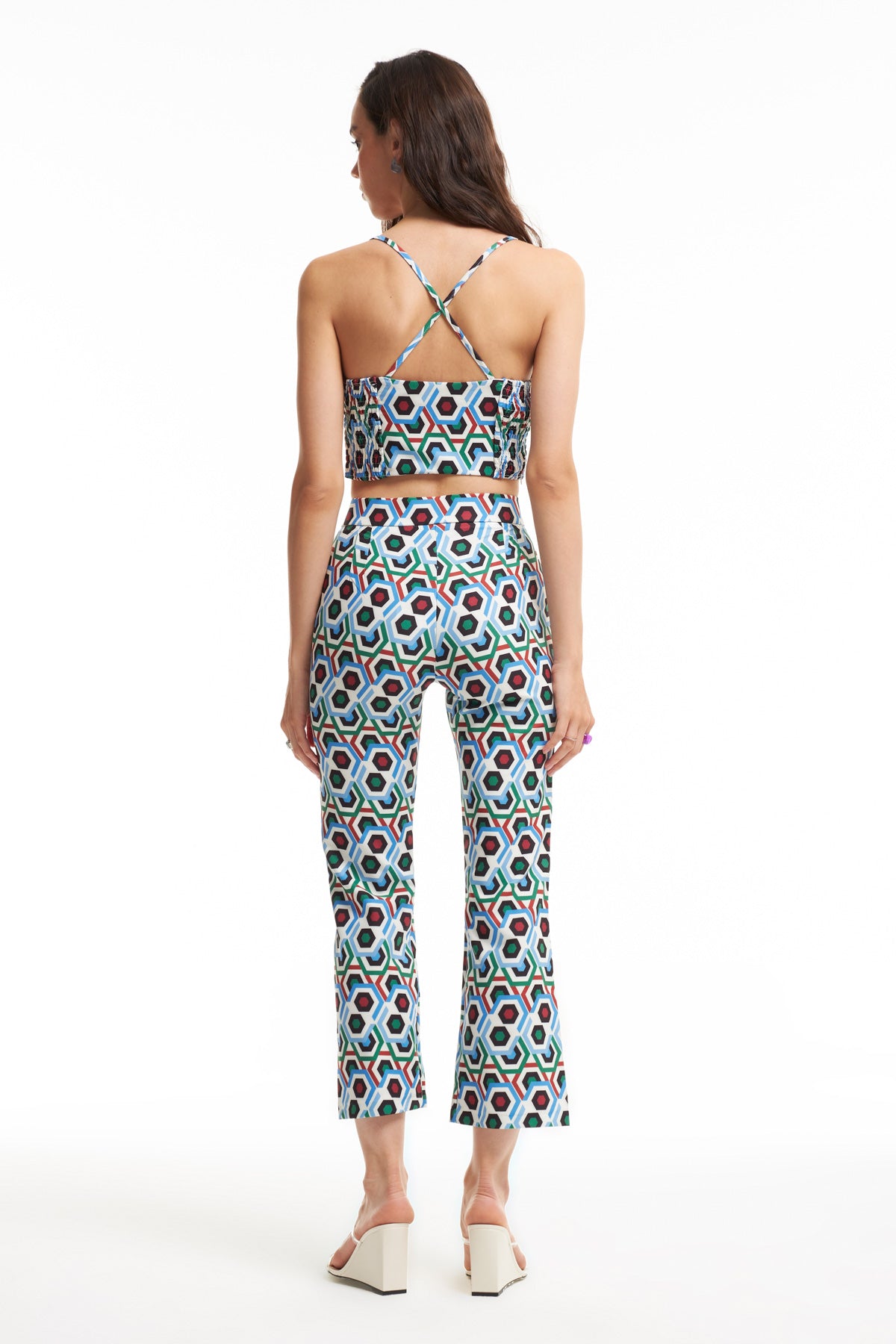 High waist trousers with cotton content, concealed zipper on the front, hidden pockets, geometric pattern, suit blouse available.