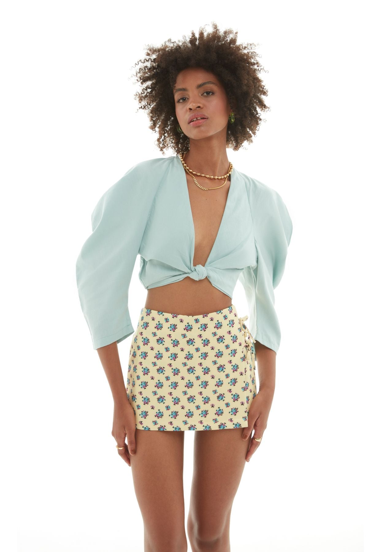 If you want to make a difference in your daily combination, you can choose the 100% cotton chest combination knot detail blouse model. You can complete your summer look by combining the balloon sleeve blouse model, which helps to make your shoulders look wider, with the tie-detail skirt model of the same color and texture. You can complete the deep V-neck design of the crop blouse model with an ethnic necklace. It has a hidden zipper.