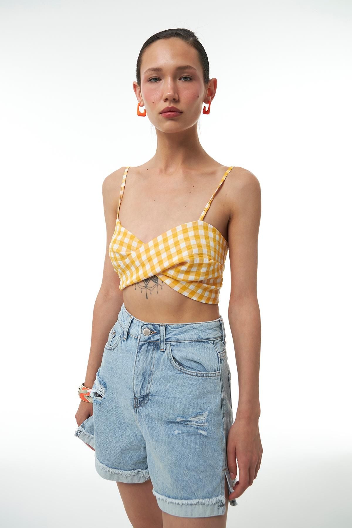 Knot detailed crop blouse model allows you to reflect the energy of the season and style when combined with the skirt model of the same color and pattern. The tie-back blouse model is a candidate to be among the pieces that add energy to your wardrobe with its color and design. The plaid blouse model, which highlights the waist with its crop design and the shoulders with its strap design, is waiting for you in our collection to add color to your style. The straps are adjustable.