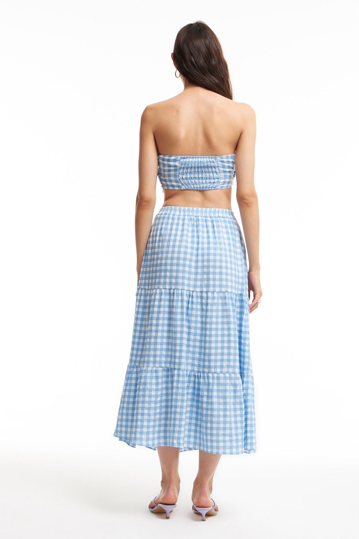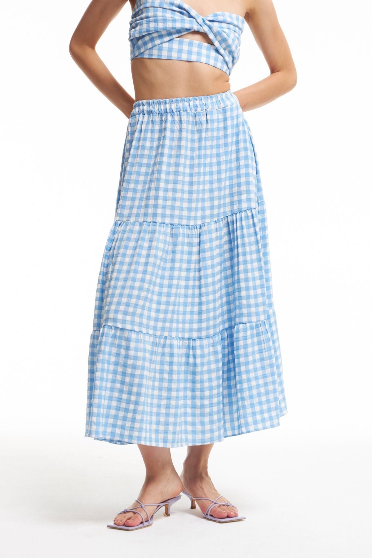 You should give a chance to the checkered midi-length skirt model that adapts to every hour of the day. Our viscose flounced midi skirt model and our blouse model in the same color and pattern complement each other perfectly, helping you achieve both a retro and a modern look. It has shirred waist and concealed zipper.