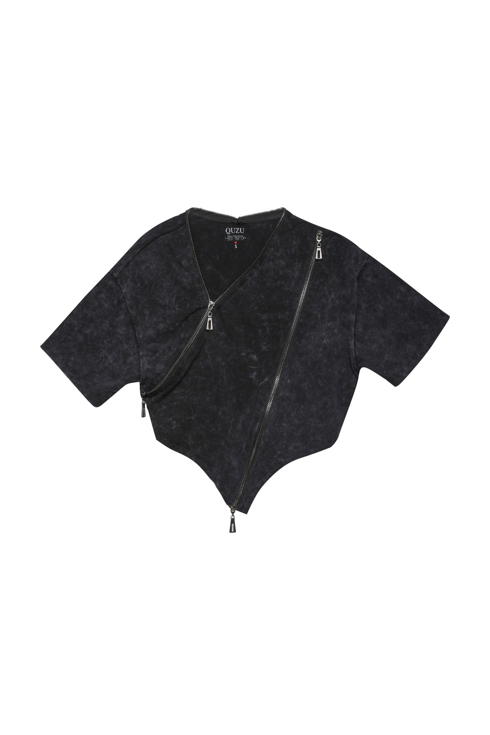 Çapraz fermuar detaylı, eskitme, kısa kollu crop tişört.