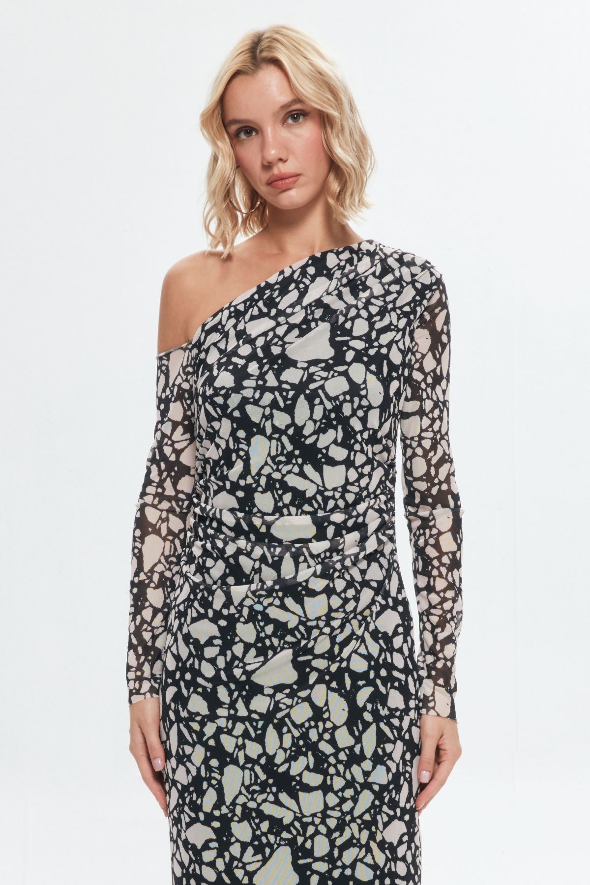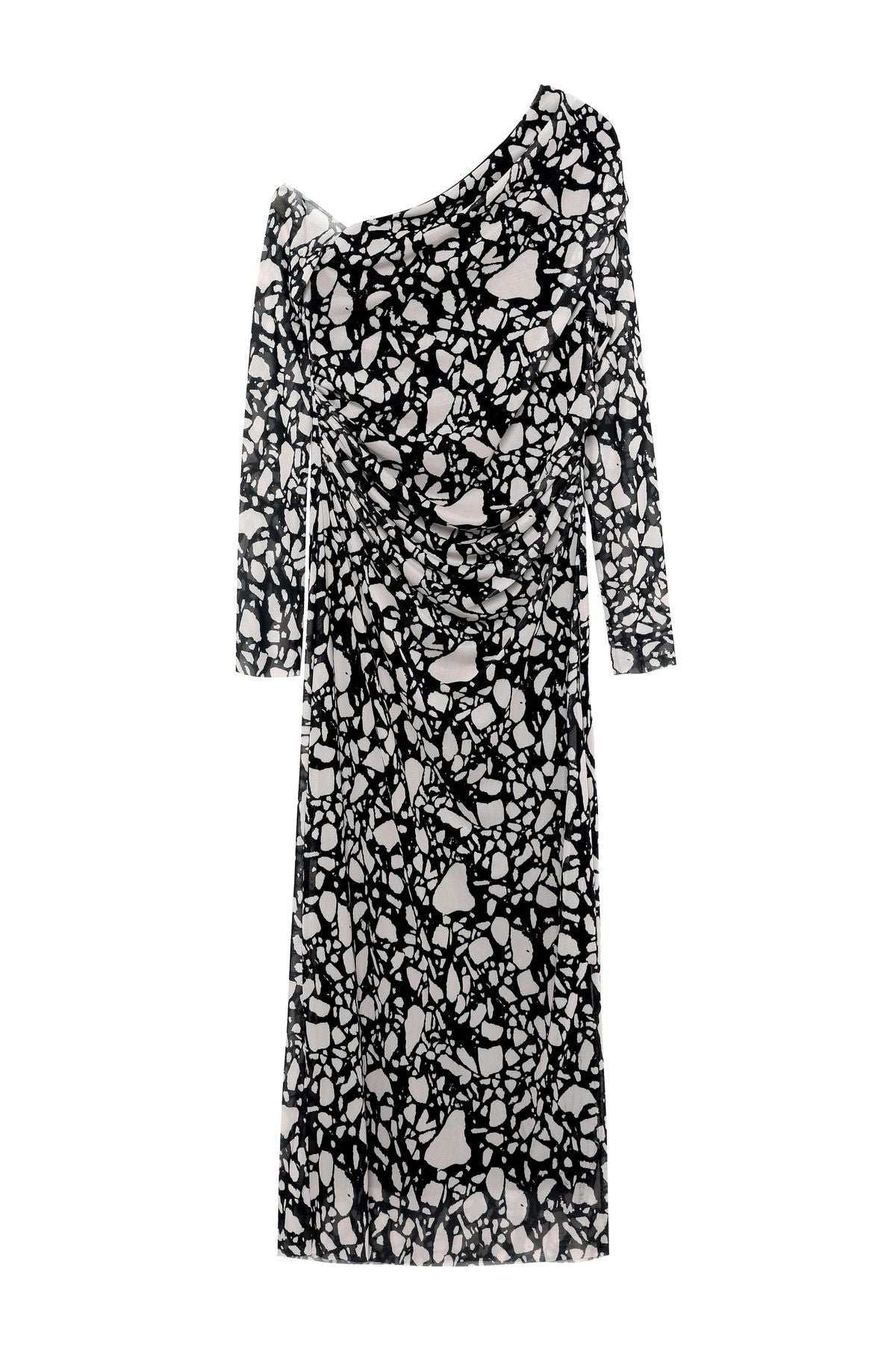Asimetrik yaka, uzun tül kollu, içi astarlı, midi boy desenli elbise.