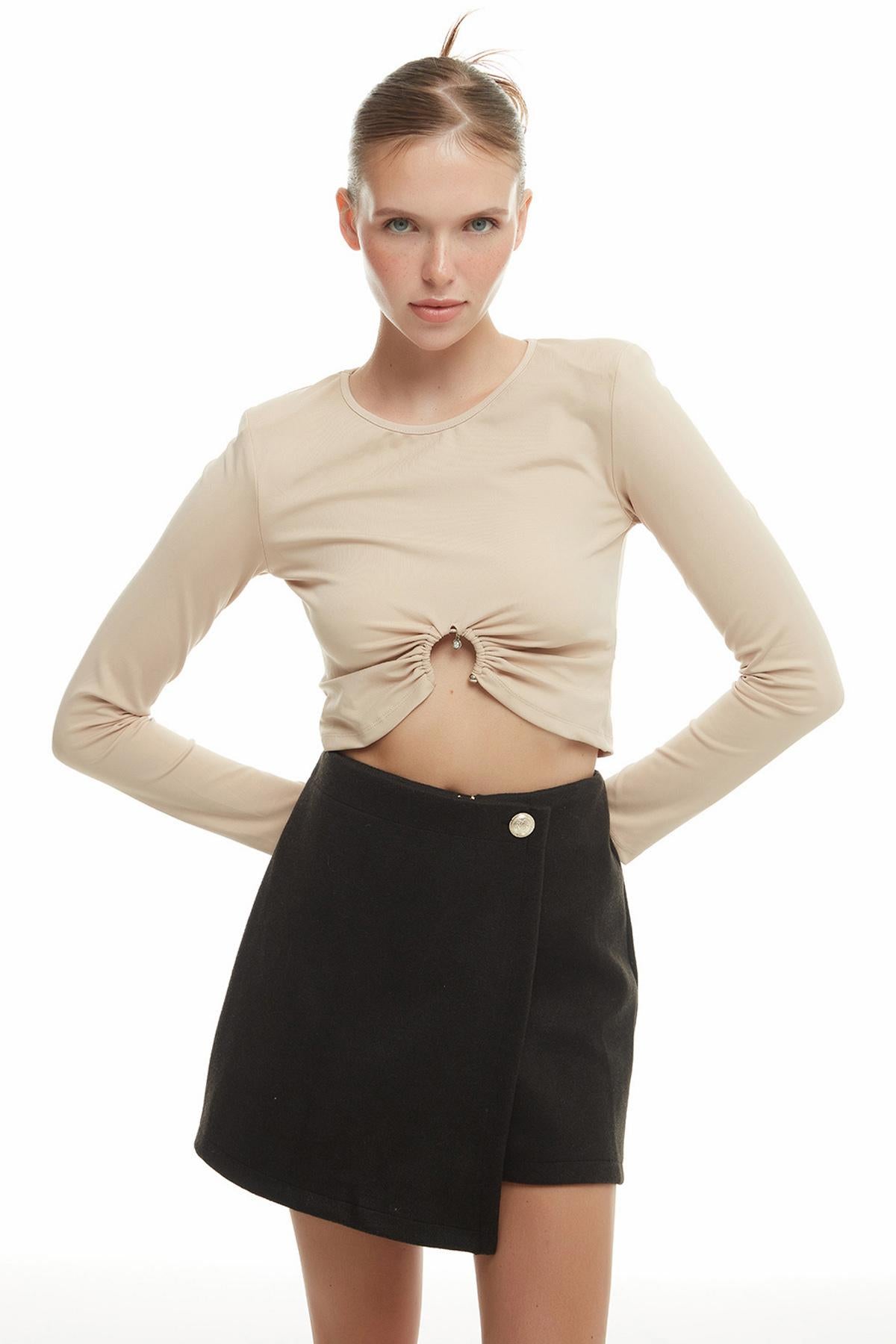 Ring Detailed Crop Blouse Beige